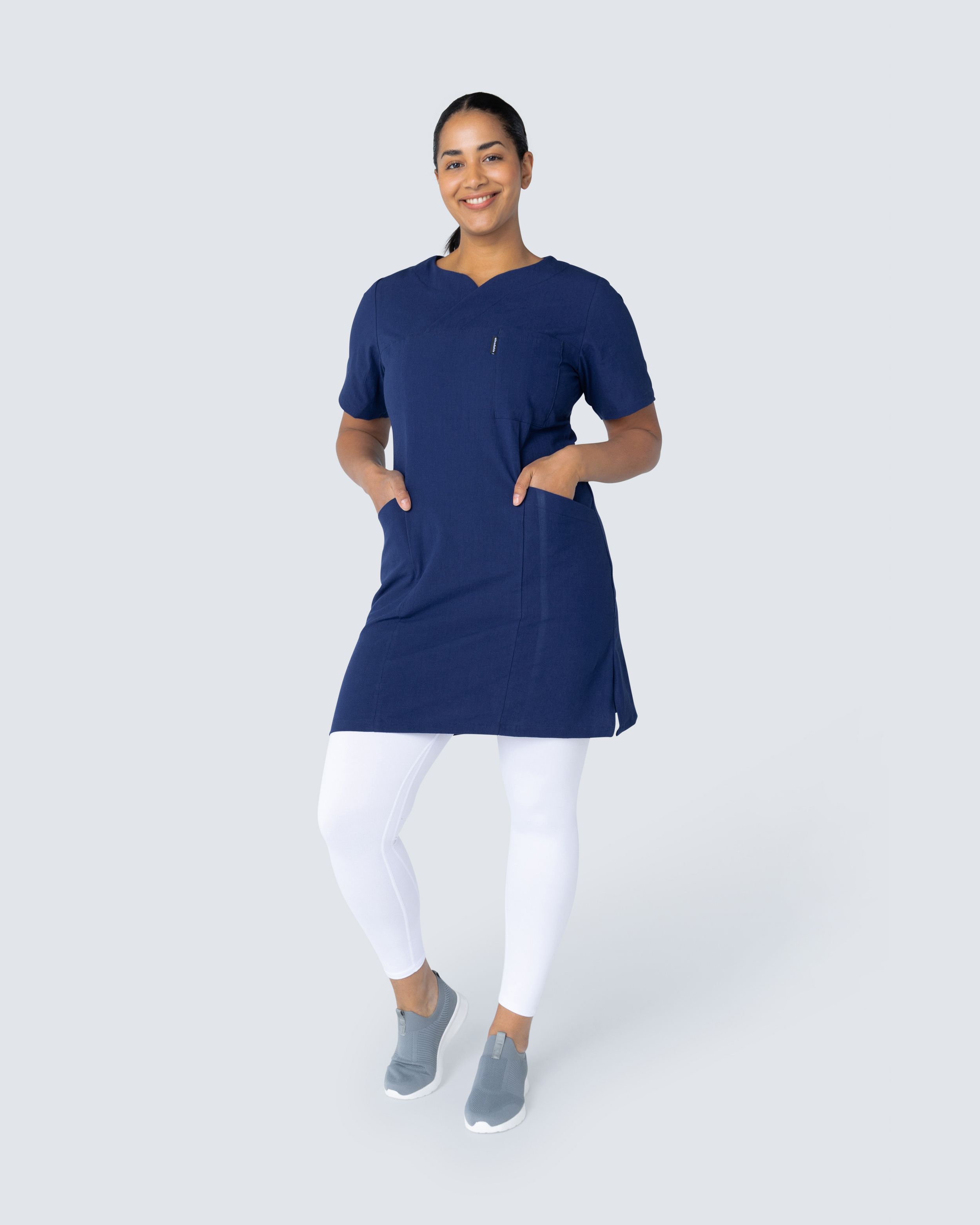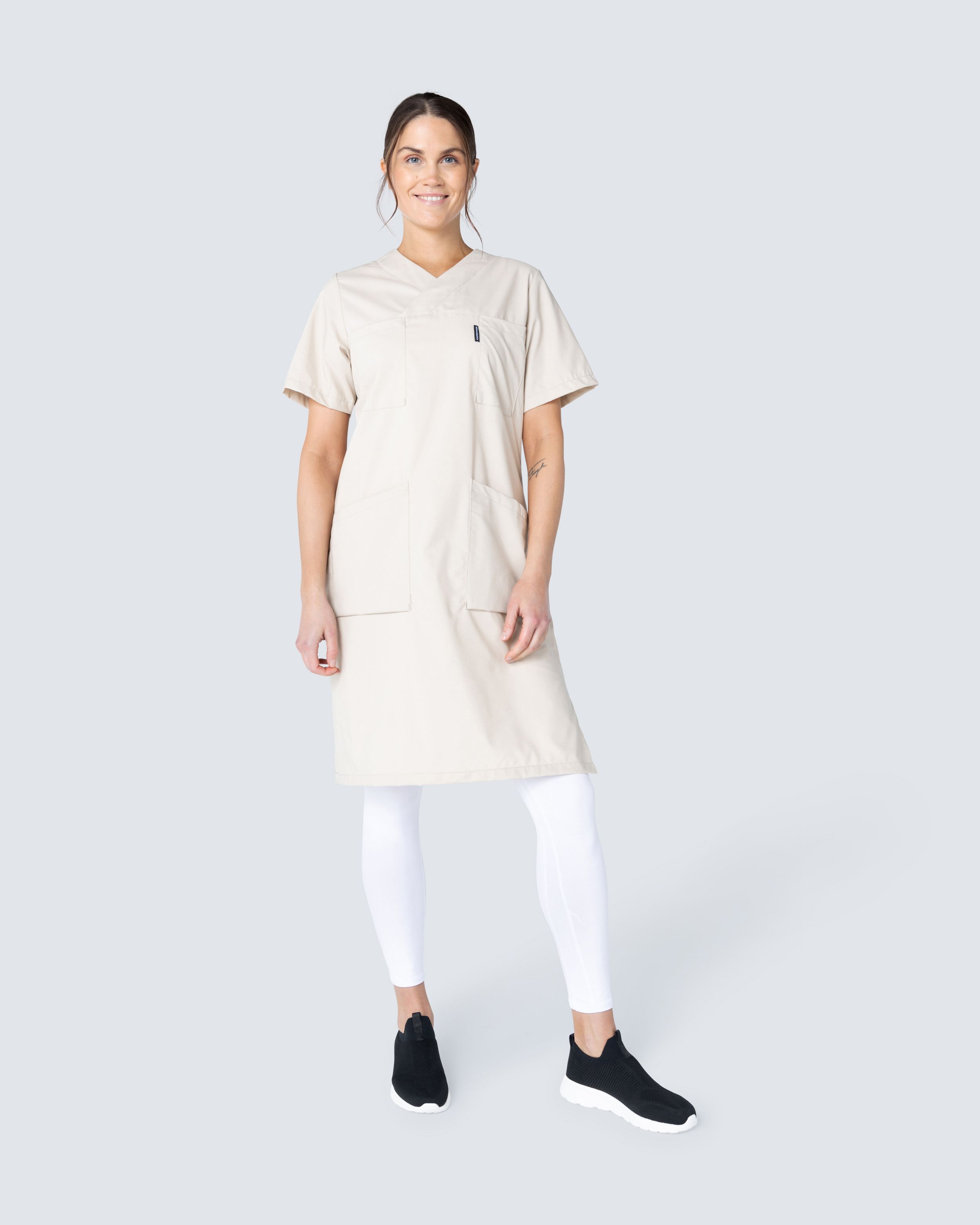 • Slits i sidan – Ökar rörelsefriheten vid rörliga arbetsmoment utan att klänningen ska kännas för vid i passformen.