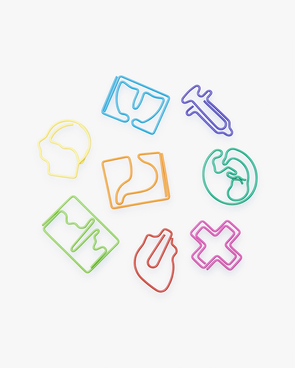 Snygga gem som gör dina papper lite roligare! Dessa gem är anatomiska och vårdrelaterade i formen och finns i åtta olika modeller. Så om du jobbar på exempelvis förlossningsavdelningen, hade det inte varit coolt om alla gemen var formade som en livmoder? Varje modell har sin färg. Varje förpackning innehåller ca 30 gem.