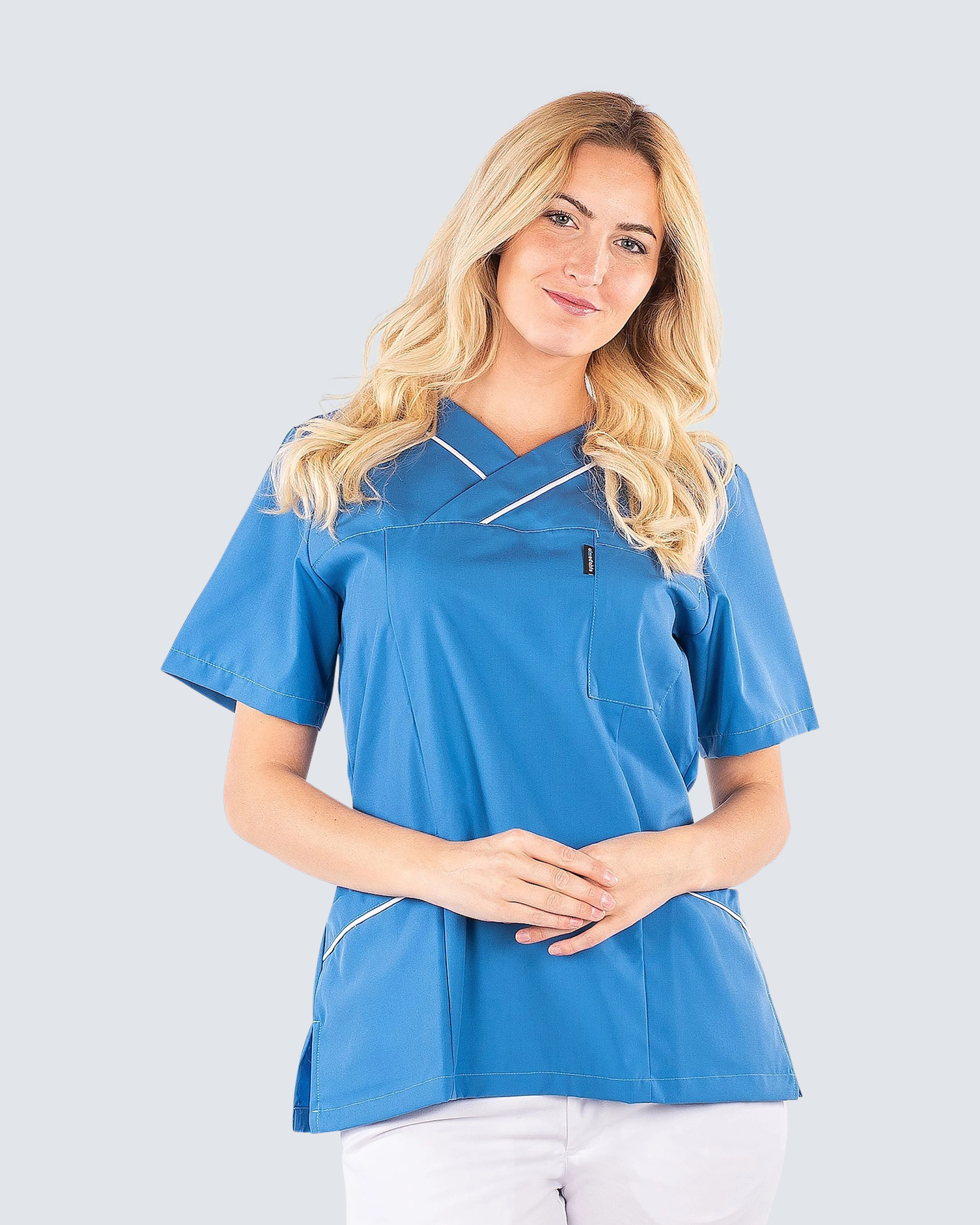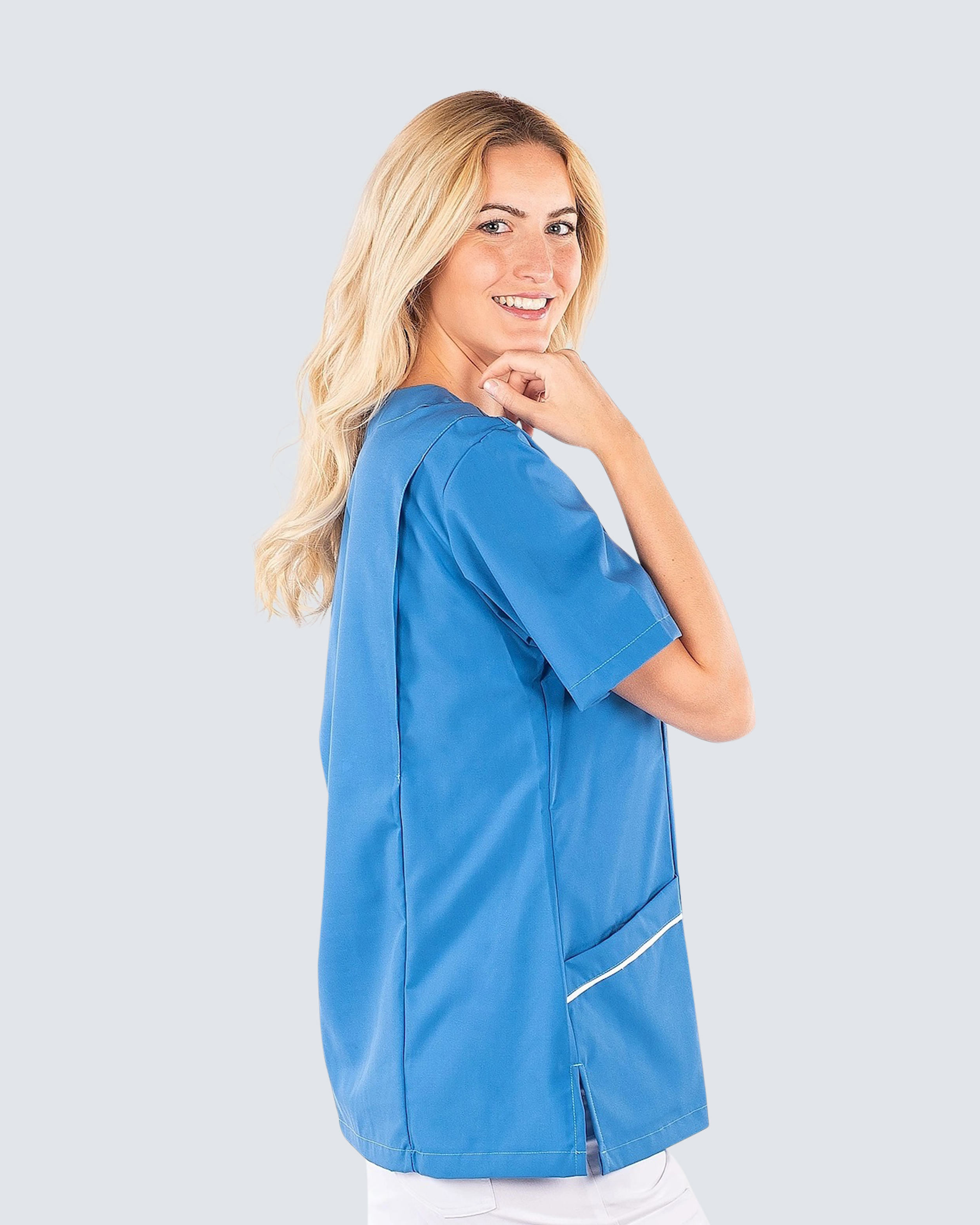 Bekväm arbetsblus i lätt insvängd modell som ger en fin passform. Blusen har en dekorativ passpoal längs hals och höftfickor vilket ger en vacker detalj. Plagget är tillverkat i en Tencel/polyester-blandning för en mjuk och skön känsla samtidigt som plagget blir slitstarkt och färgbestädningt. Tencellen gör att plagget andas och transporterar fukt och hjälper dig att hålla dig sval under arbetspassen.