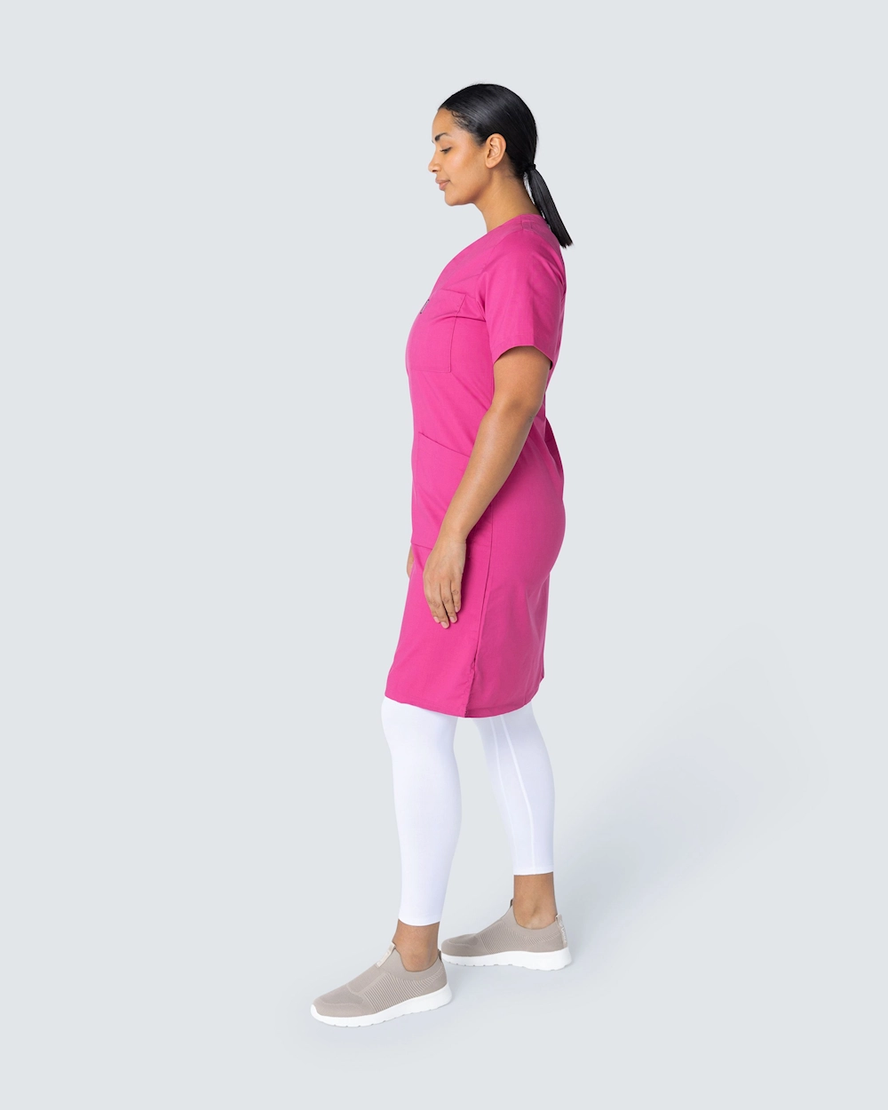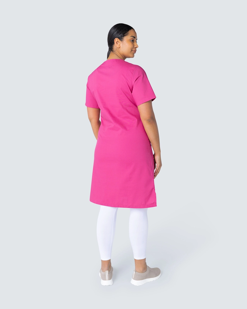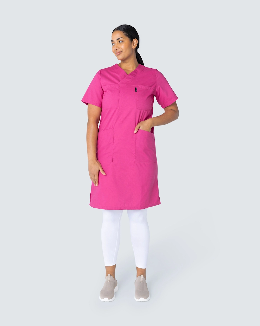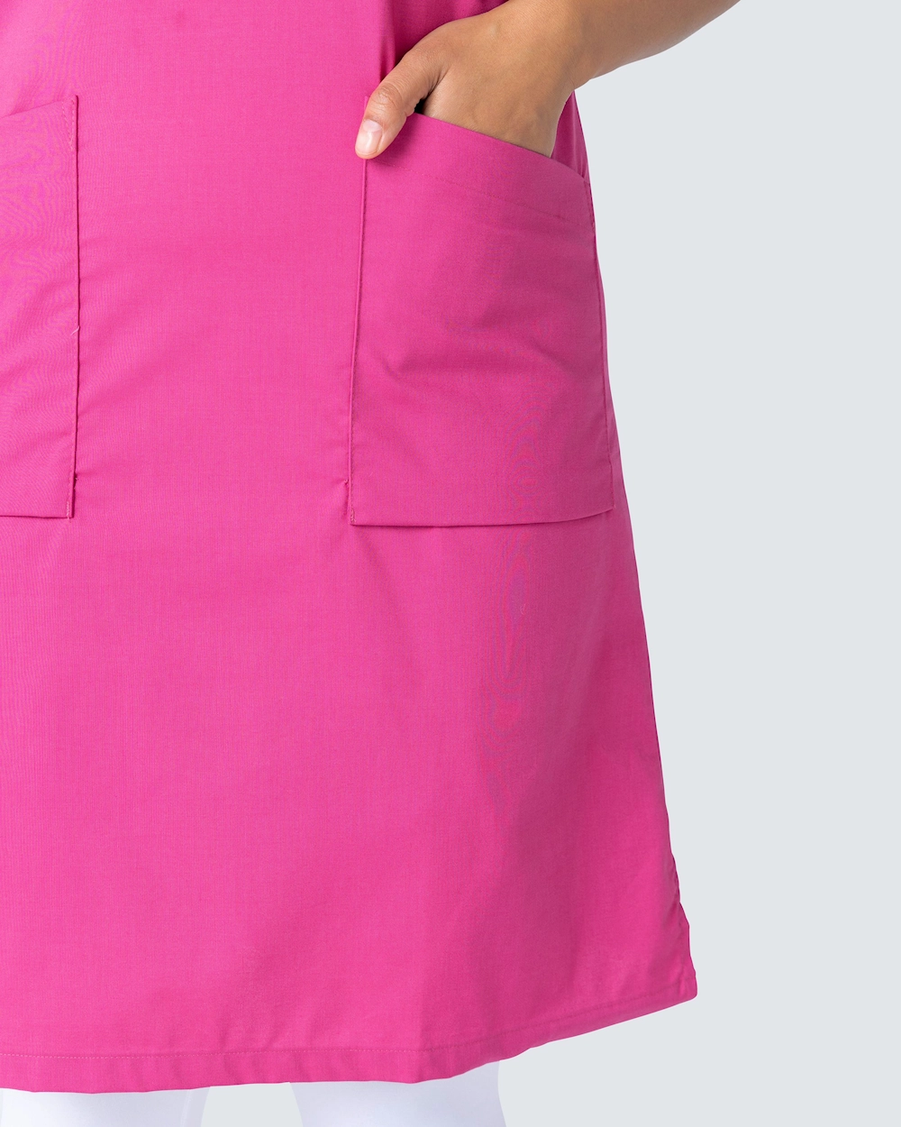 Bekväm arbetsklänning i bomulls-/polyesterblandning. Klänningen är lätt a-linjeformad vilket ger en fin silhuett. Klänningen har gott om plats för arbetsredskap med två bröstfickor och två höftfickor. Sidfickorna har en extra mobilficka samt nyckelhälla. Klänningen har slits på båda sidorna för ökad rörelsefrihet.