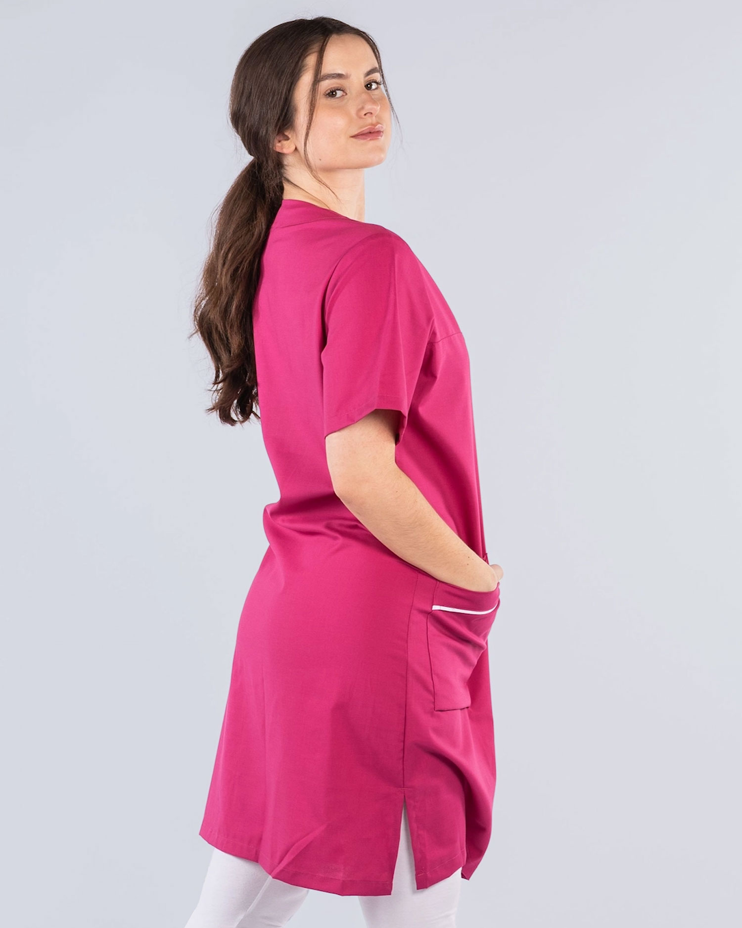 Arbetsklänning med fina detaljer med passpoal vid hals och fickor. Klänningen har bröstficka och två rymliga höftfickor. Med sprund i sidorna får du ett bekvämt plagg med god rörelsevidd.