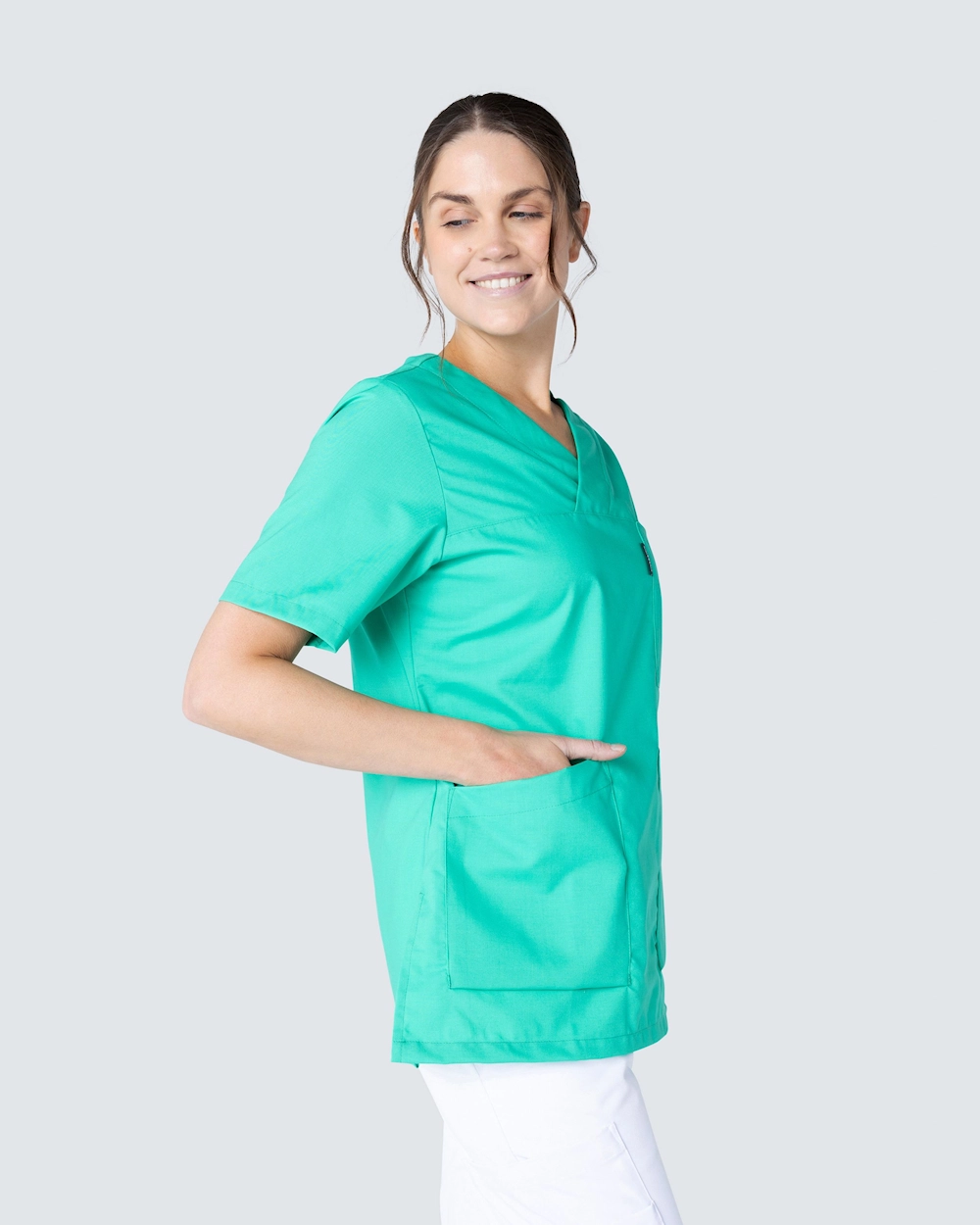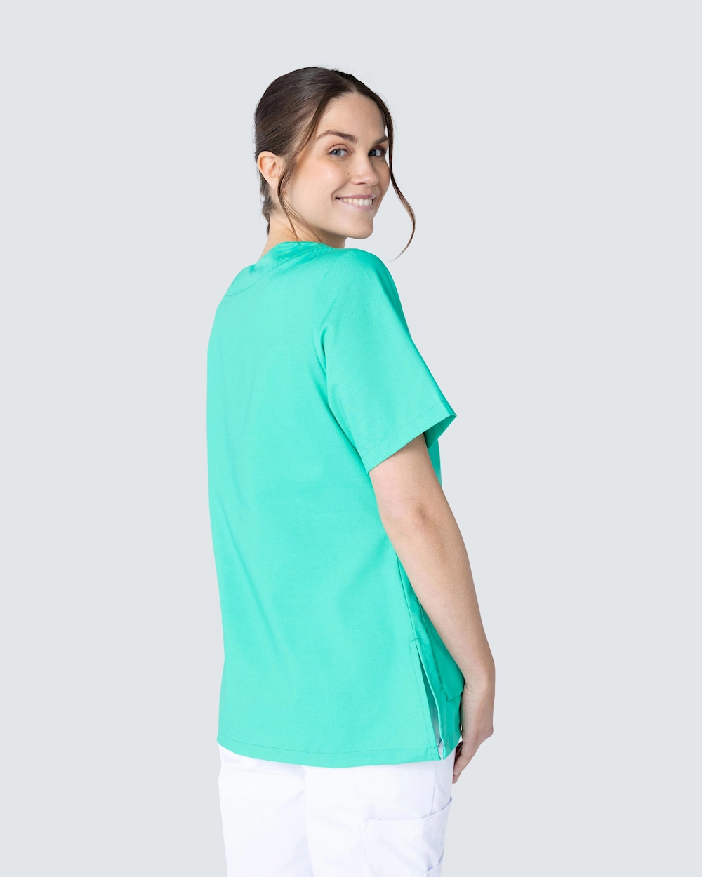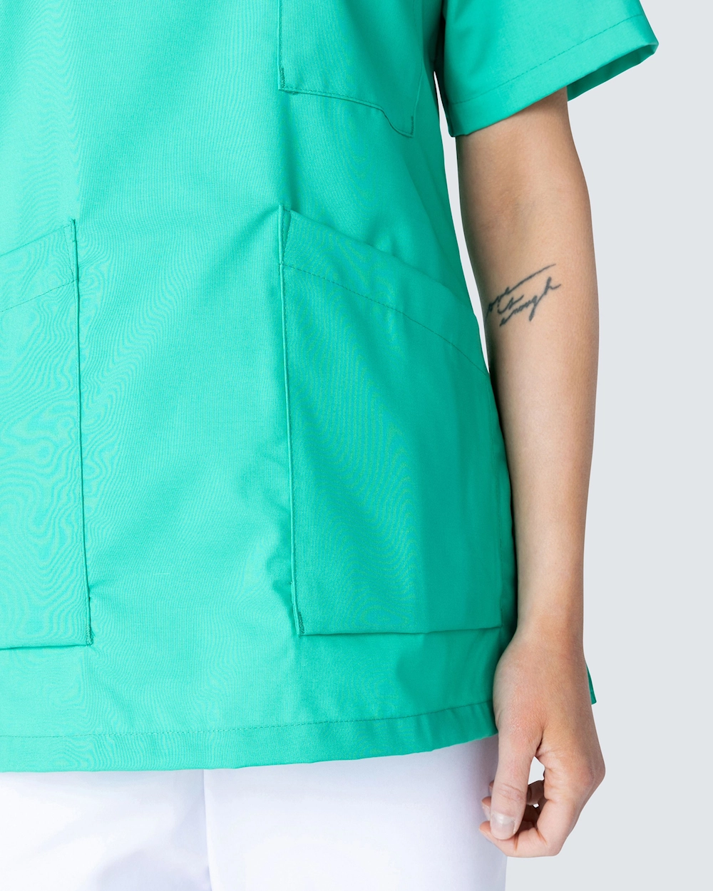 Feminin arbetsblus i lätt insvängd modell och dekorativ v-ringning. Blusen har en bröstficka samt två rymliga höftfickor, med en extra mobilficka och nyckelhälla på insidan. Sprund i sidorna ger god rörelsevidd.