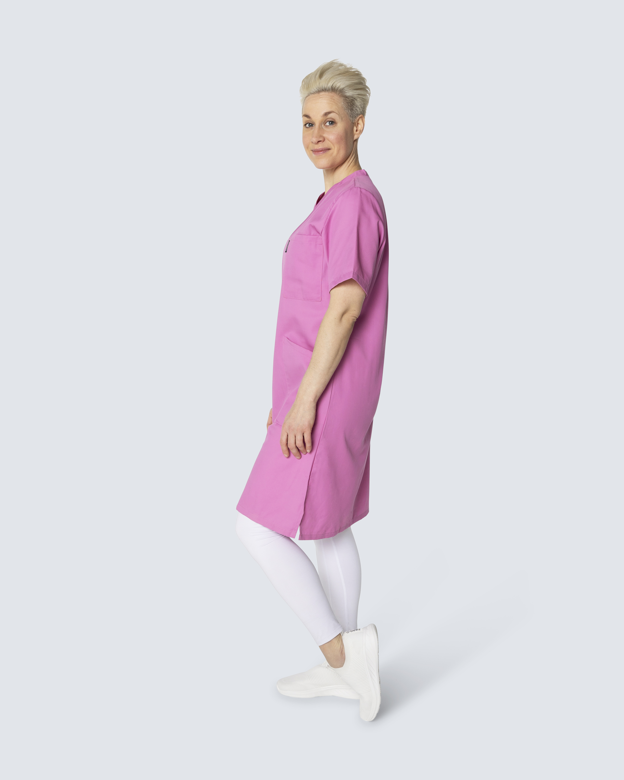 Bekväm och funktionell vårdklänning med kort ärm. Sprund i sidan för optimal rörelsefrihet. Klänningen är tillverkad i 50% Tencel, vilket ger hög andningsförmåga och luftig komfort. En bröstficka och två sidfickor med extra telefonficka och nyckelhälla. Lätt insvängd i modellen.