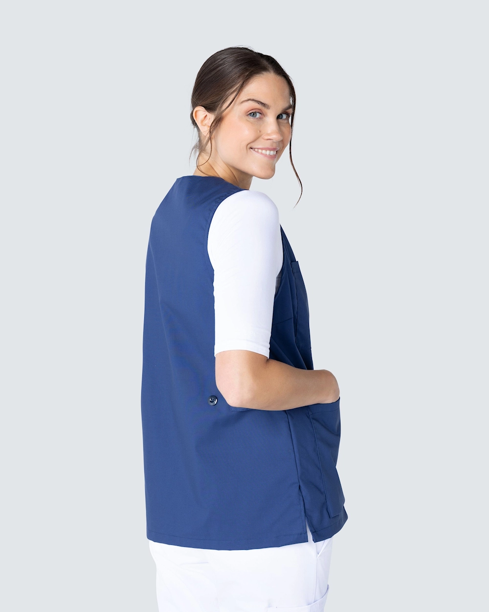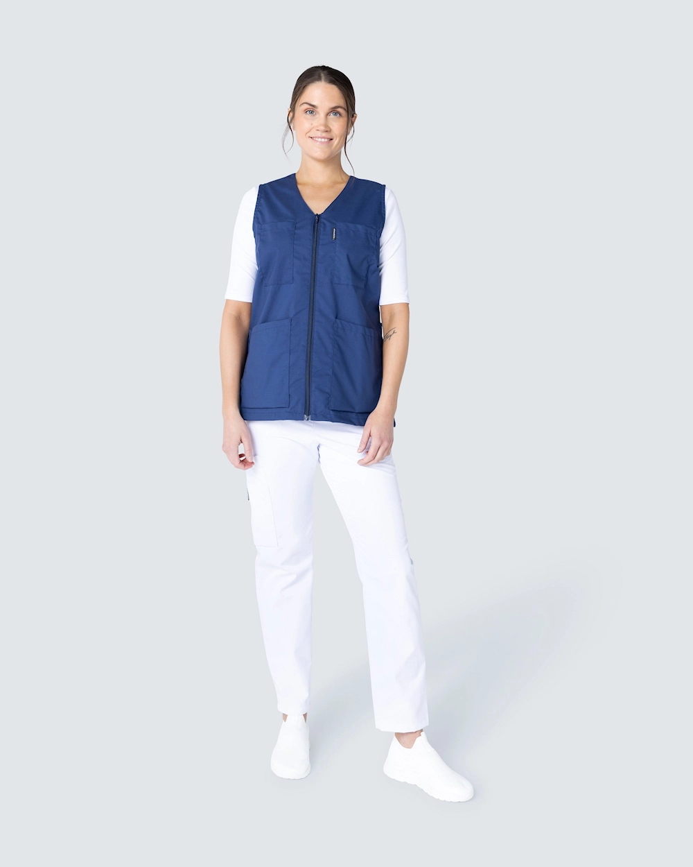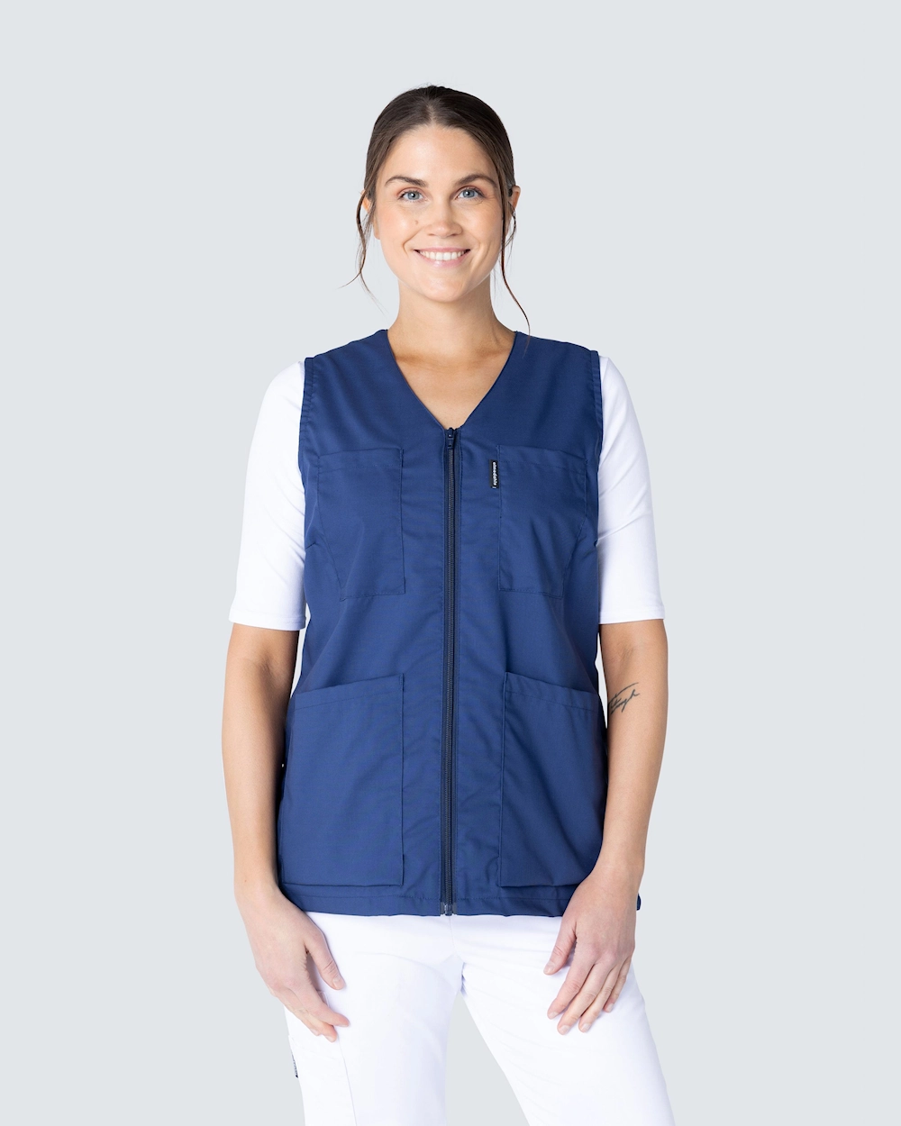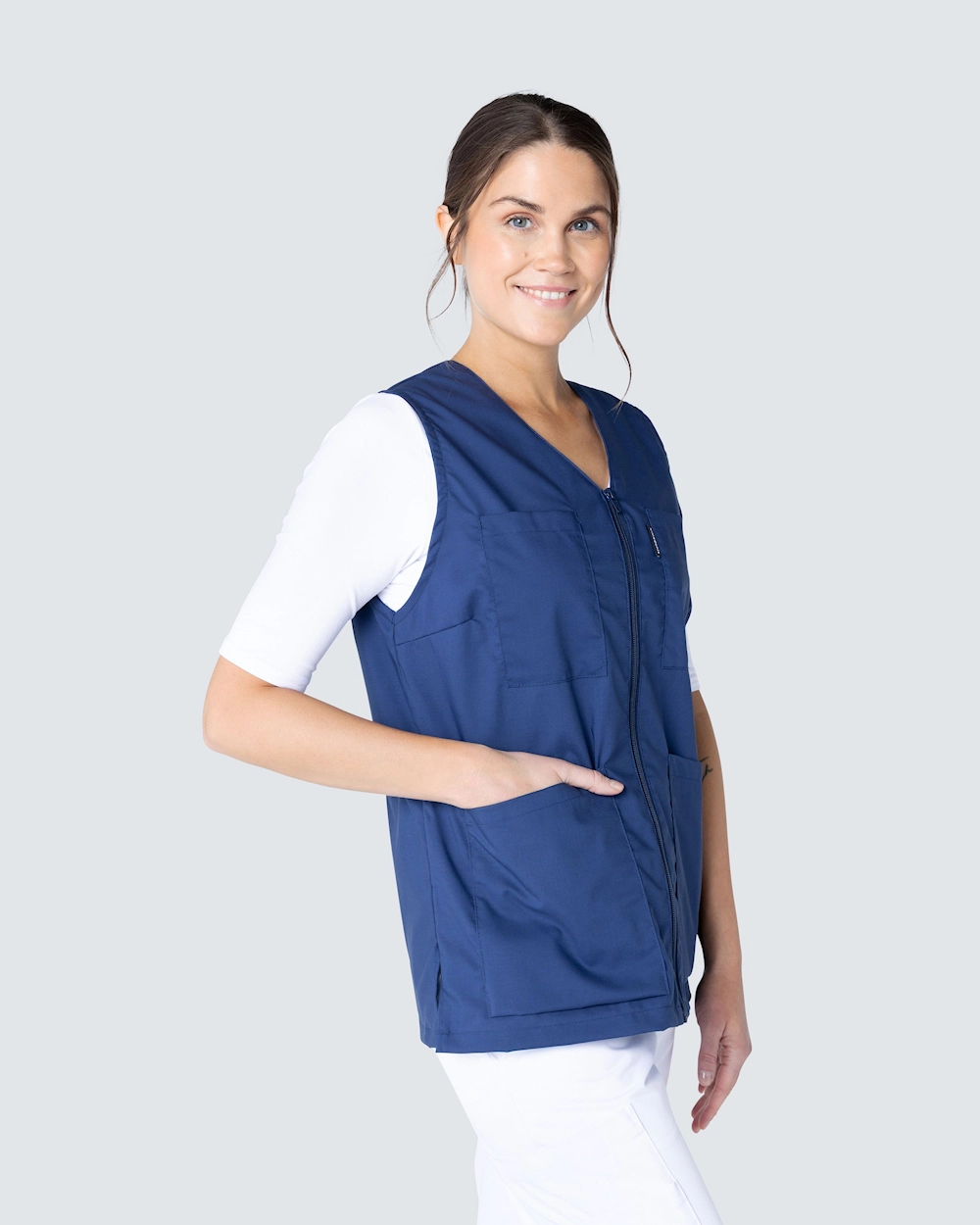 Denna arbetsväst har v-ringad hals och är lätt figursydd för en fin passform. Med två bröstfickor och två sidfickor har du gott om plats till pennor, block och arbetsredskap du behöver ha med dig. Västen har justerbar midja med knappslejf baktill för att du ska kunna anpassa passformen. Med sprund i sidorna får du gott om rörelsevidd och ett bekvämt arbetsplagg.