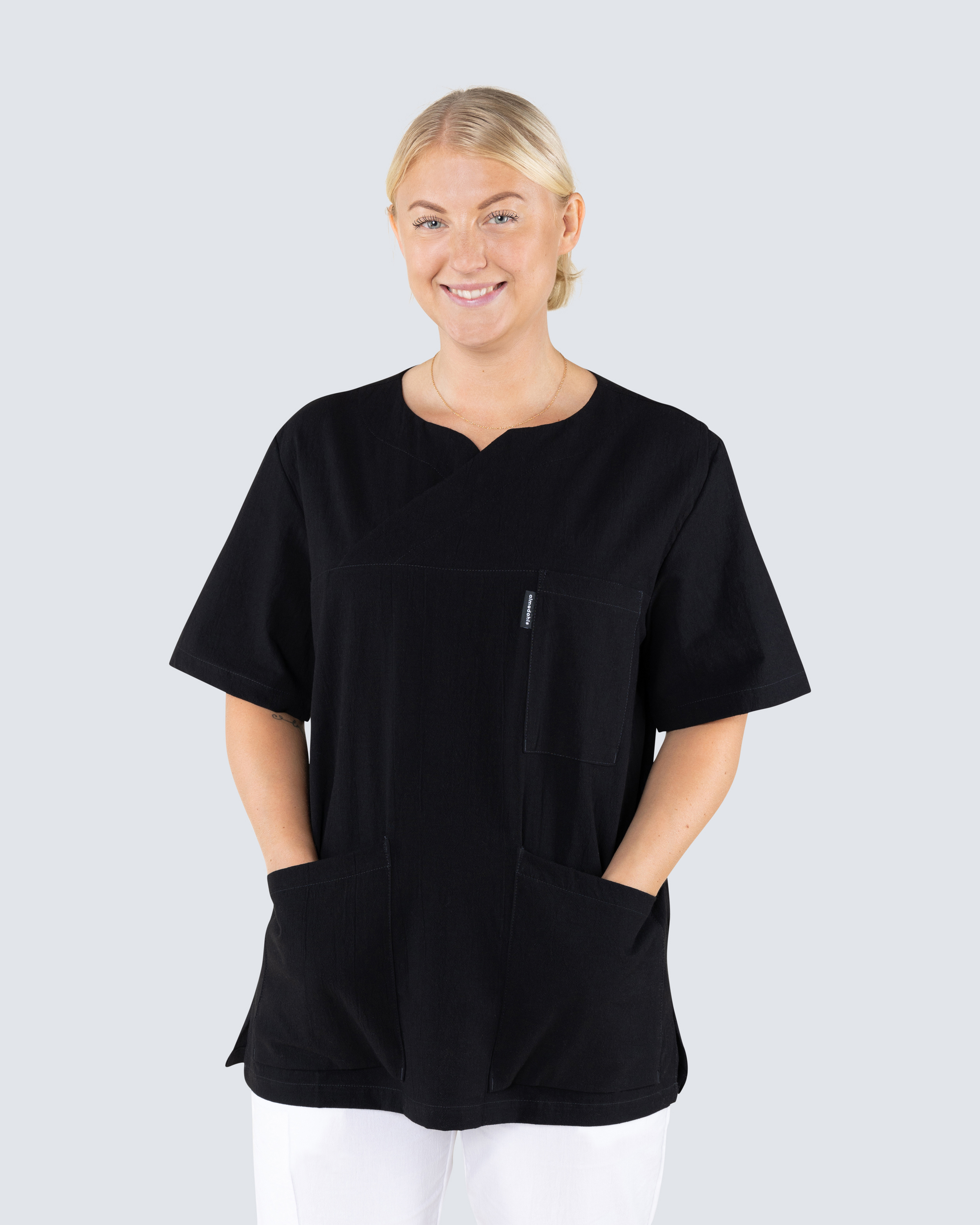 Bussarong i rak unisexmodell med praktiska och rymliga fickor som har gott om plats för arbetsredskap. Höftfickorna har mobilficka och nyckelhälla där du enkelt kan fästa nycklar eller ID-kort. Bussarongen har rund v-hals vilket ger en fin detalj. Med sprund i sidorna får du gott om rörelsevidd. Bussarongen är tillverkad i krinklad bomull vilket ger en sval och behaglig känsla. Det krinklade tyget minskar även behovet av skötsel, såsom strykning.