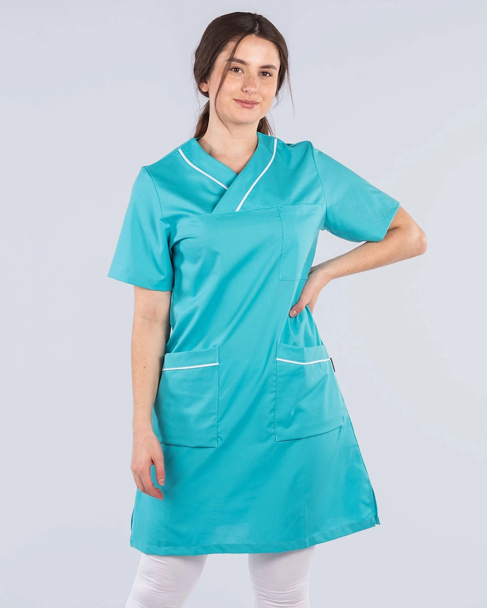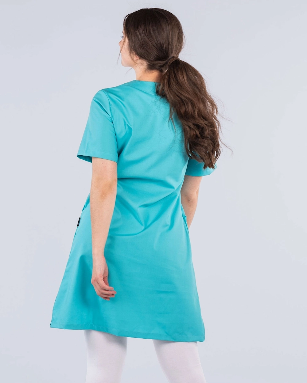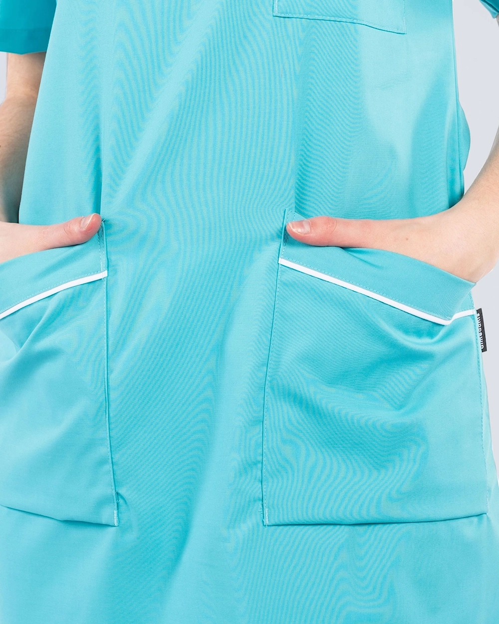 Arbetsklänning med fina detaljer med passpoal vid hals och fickor. Klänningen har bröstficka och två rymliga höftfickor. Med sprund i sidorna får du ett bekvämt plagg med god rörelsevidd.