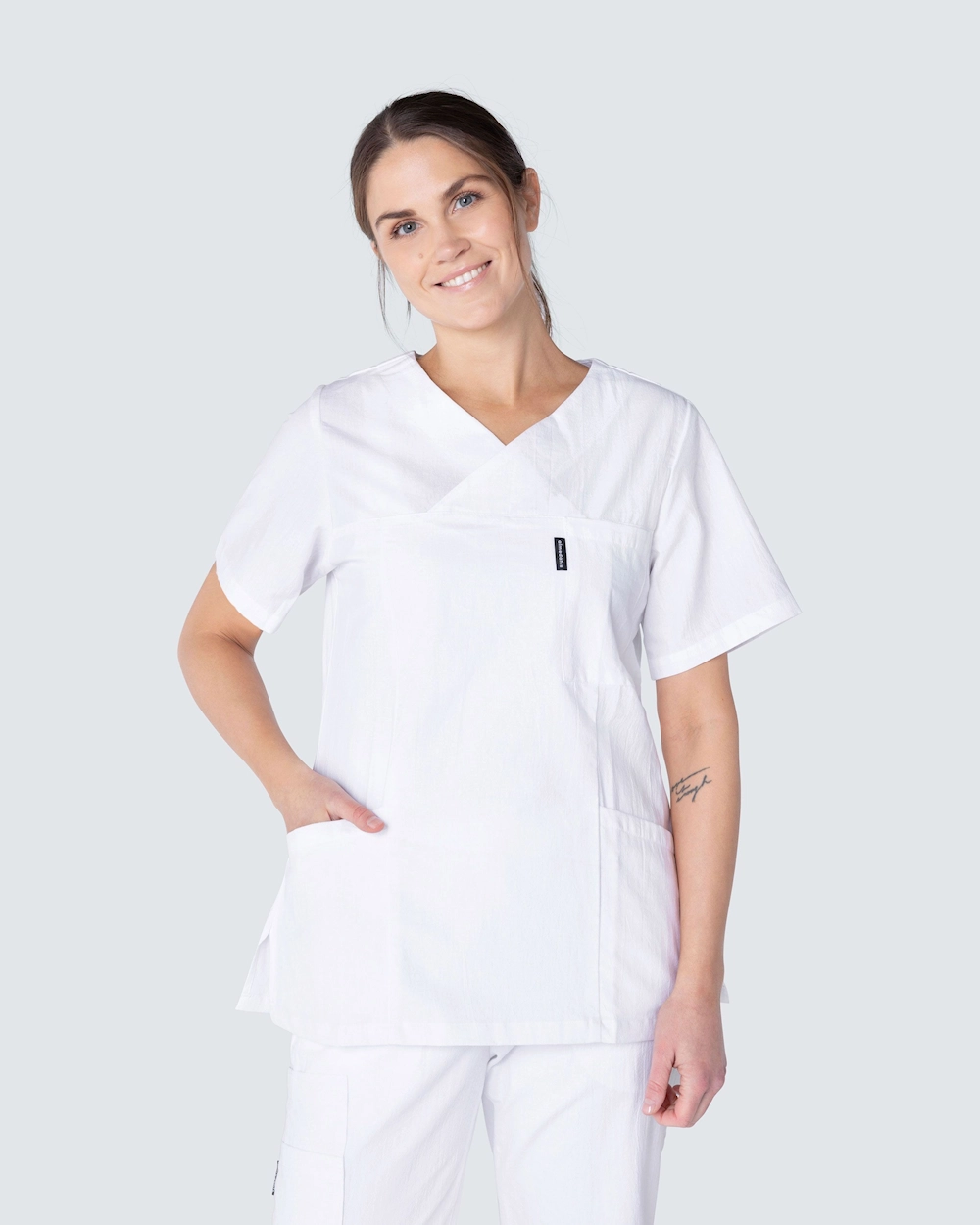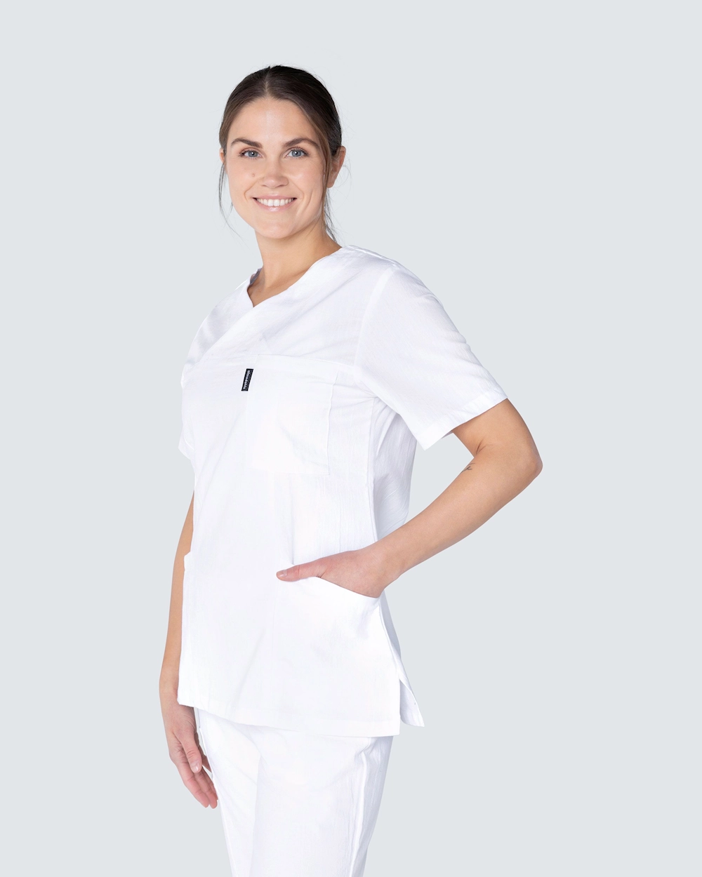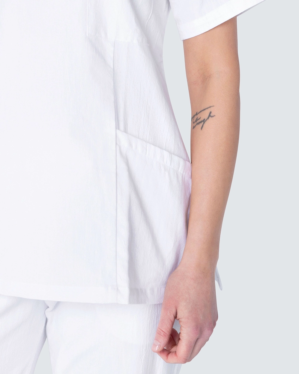 Bussarong i krinklad bomull som ger en lätt och sval känsla. Den krinklade bomullen är lättskött och kräver minimalt med skötsel, såsom strykning. Bussarongen har v-hals och är i lätt insvängd modell, vilket ger en fin silhuett och passform. Med både bröstficka och två höftfickor med mobilficka och nyckelhälla har du gott om plats för diverse arbetsredskap och artiklar du behöver under en arbetsdag.