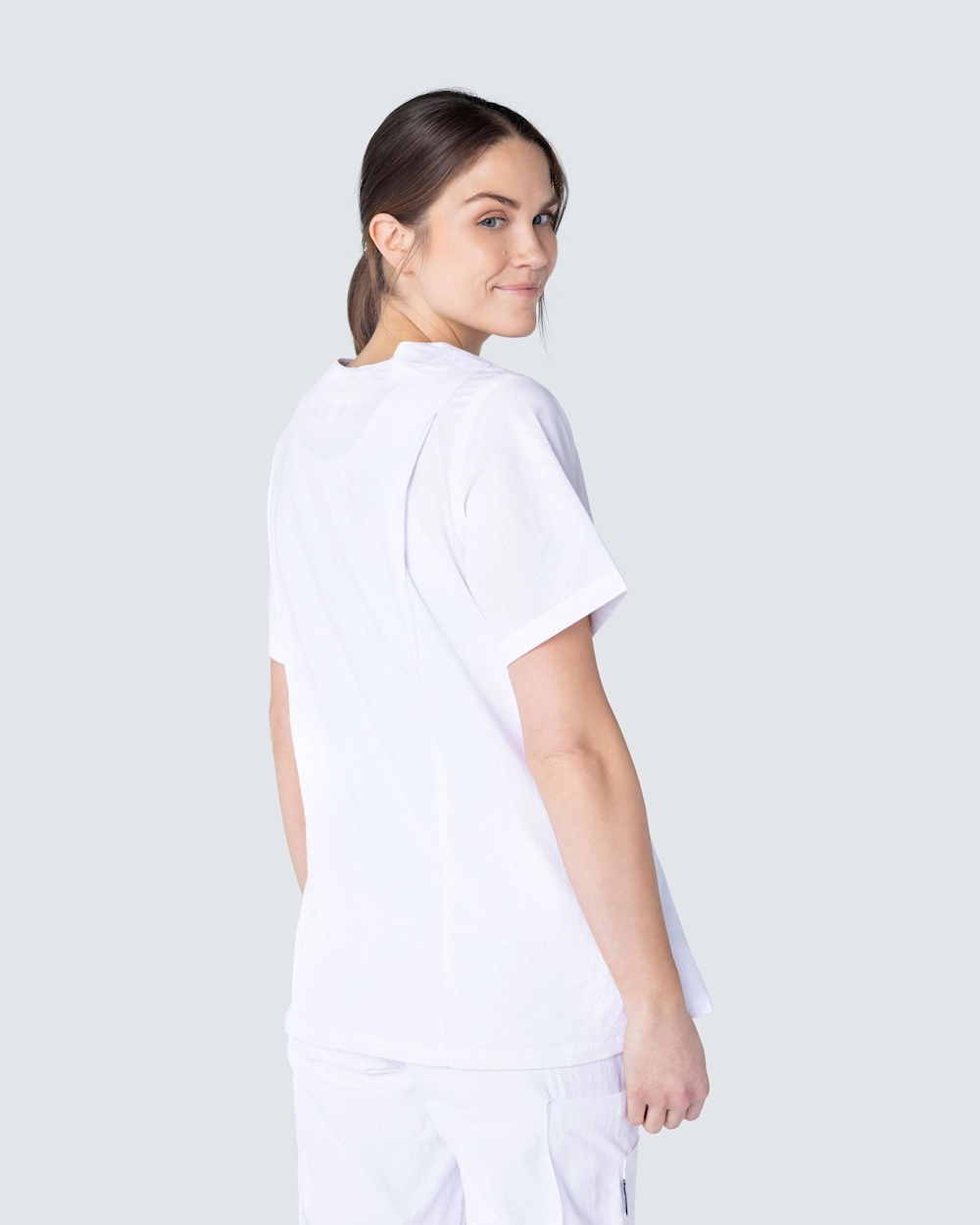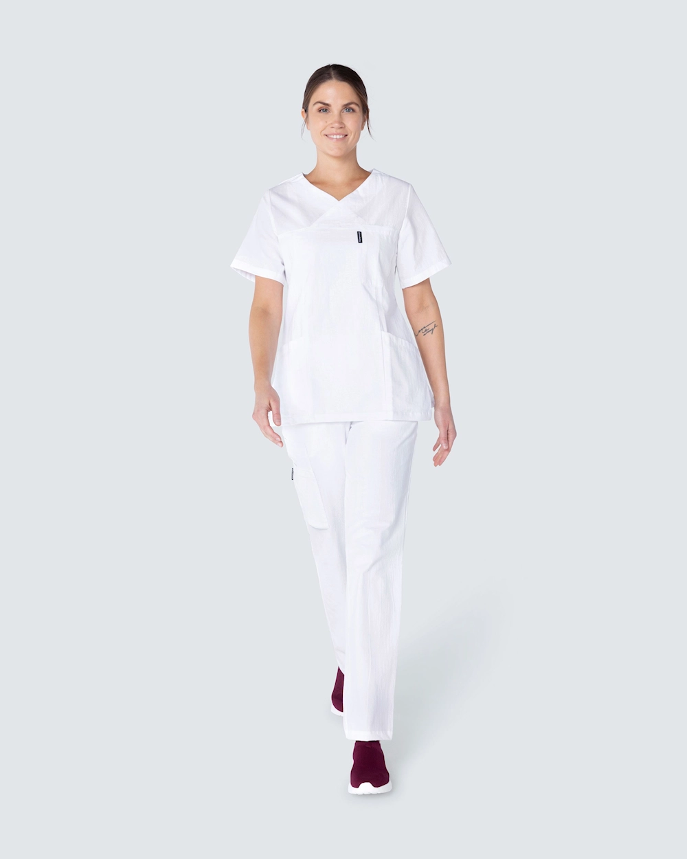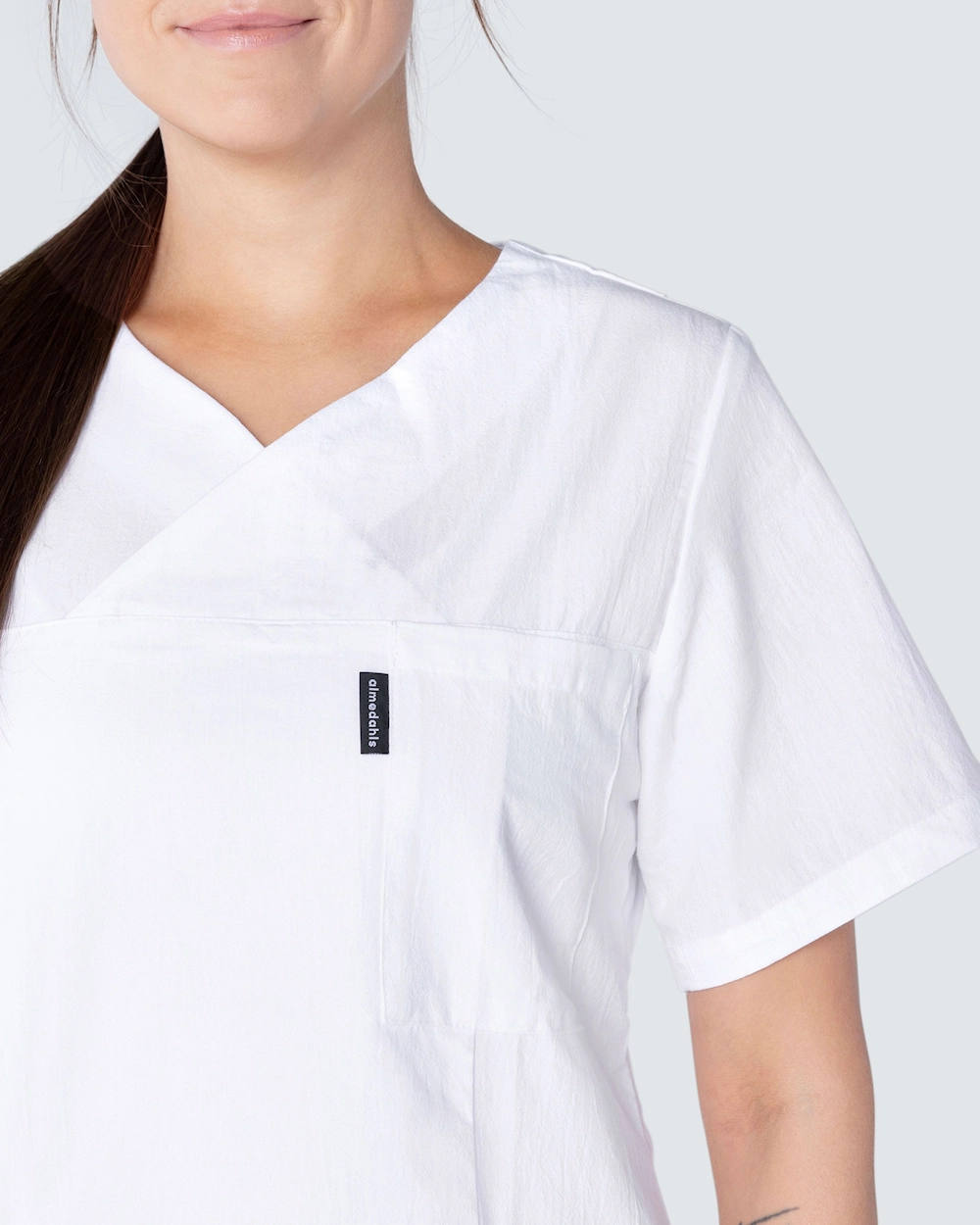 Bussarong i krinklad bomull som ger en lätt och sval känsla. Den krinklade bomullen är lättskött och kräver minimalt med skötsel, såsom strykning. Bussarongen har v-hals och är i lätt insvängd modell, vilket ger en fin silhuett och passform. Med både bröstficka och två höftfickor med mobilficka och nyckelhälla har du gott om plats för diverse arbetsredskap och artiklar du behöver under en arbetsdag.