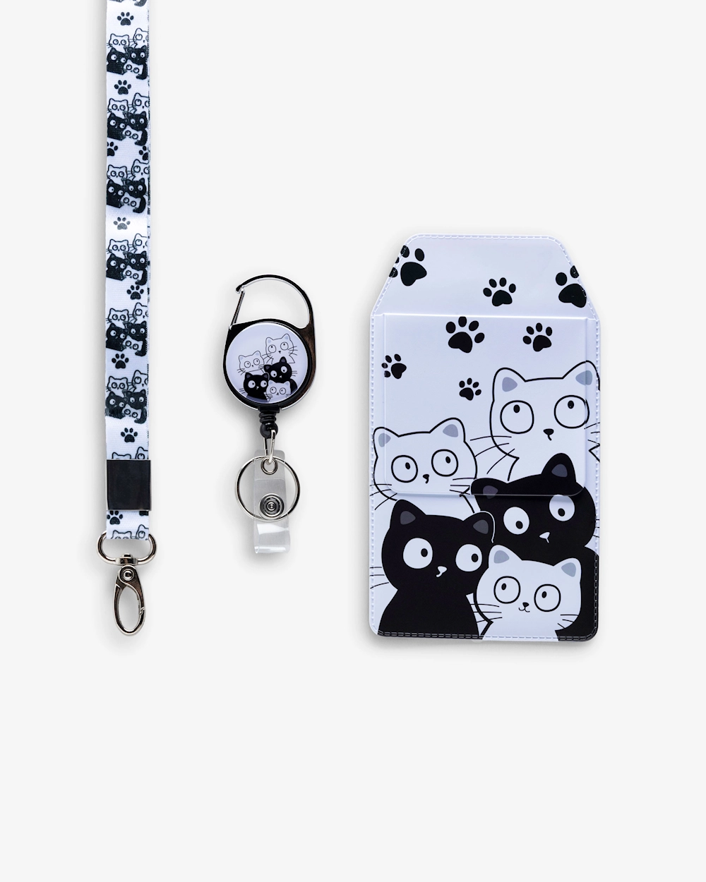 För alla kattälskare där ute presenterar vi stolt vårt Arbetstillbehör Kit Katter. Låt din personlighet lysa igenom med dessa charmiga accessoarer prydda med söta katter. Setet är inte bara fint att se på, utan också högst funktionellt. Det hjälper dig att organisera dina pennor, hålla koll på nycklarna och alltid ha ID-kortet redo när du behöver det.