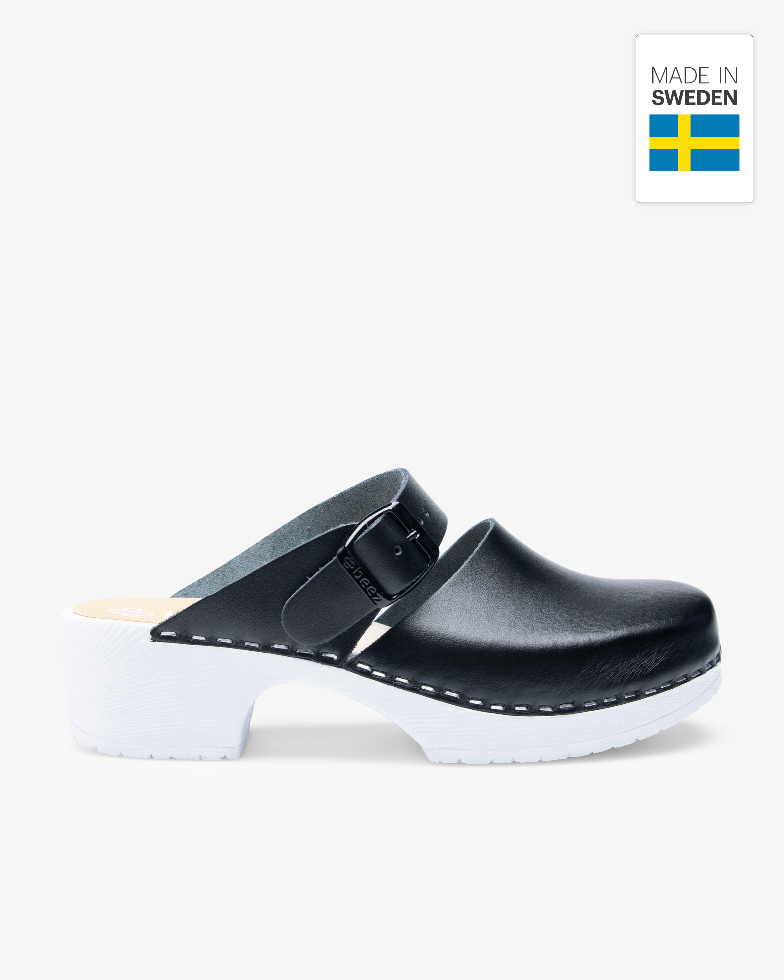 Beez Belle är en trendig arbetssko med snygg design. Inspirerad av en klassisk träsko med moderna detaljer som justerbart spänne och luftiga insnitt. Skon har en stabil sula i PU-gummi som ger ett bra grepp, med ett inlägg av träfanéer för att ge ett stabilt stöd under långa arbetspass. Med ovandel i PU kan du enkelt rengöra och torka av skon - optimalt för dig som jobbar i vården.