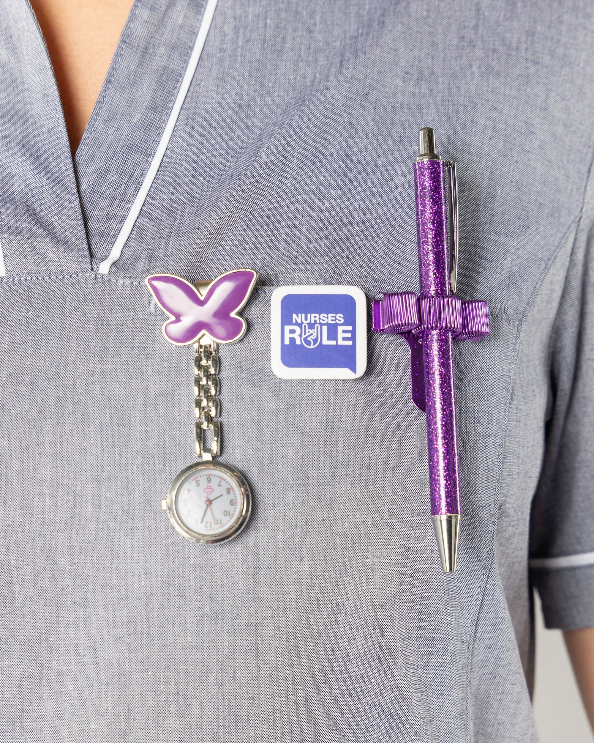 Med en bläckpenna i glitter sätter du en snygg touch på din arbetsoutfit. Pennan har hake för att enkelt förvara i din pennficka eller bröstfickan på din arbetsbussarong.