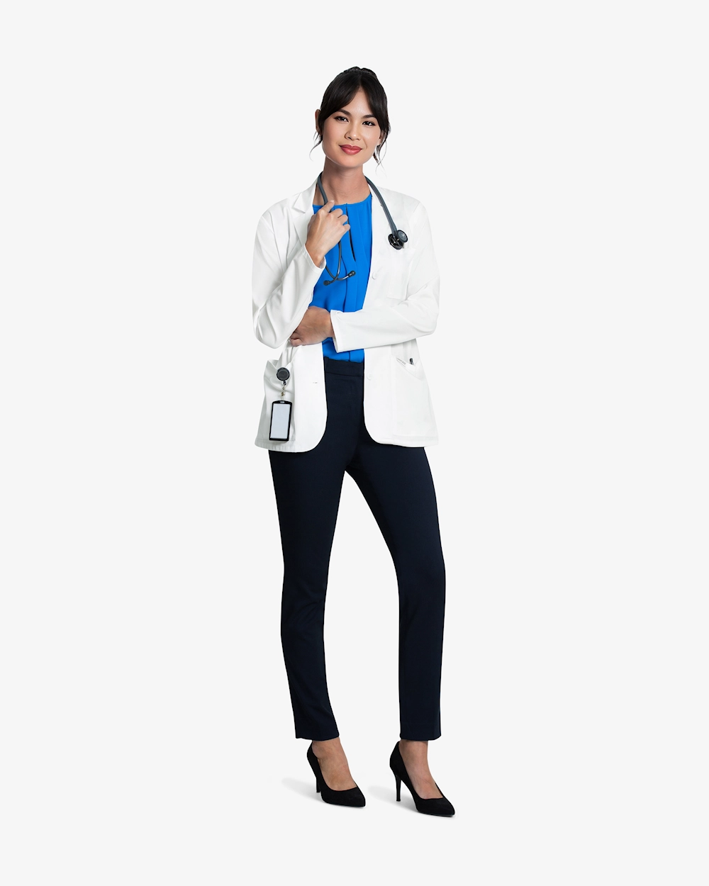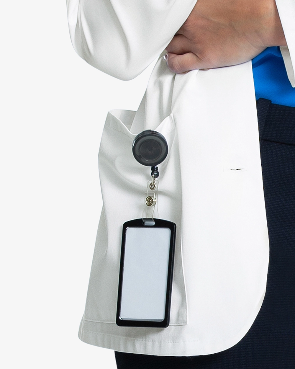Läkarrocken har en modern passform och är tillverkad i mekanisk stretch-twill för komfort och rörelsefrihet under hela arbetsdagen. Krage med slag och treknappsknäppning framtill ger ett professionellt intryck. Utrustad med en bröstficka och två stora fickor för surfplatta, samt överlappning och rundad fåll som adderar stilren funktionalitet. Rygglängd: 76 cm.