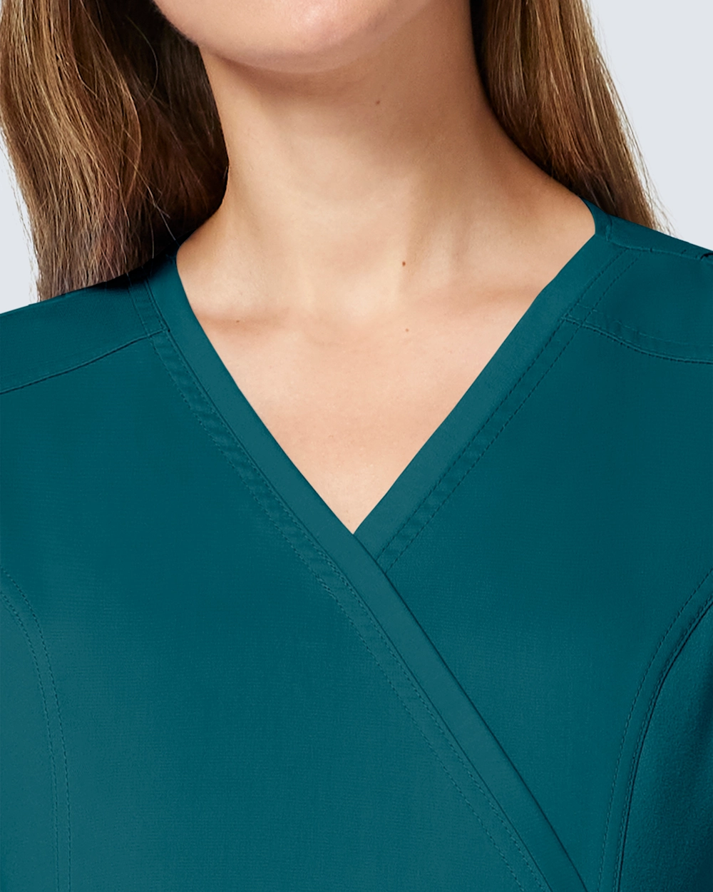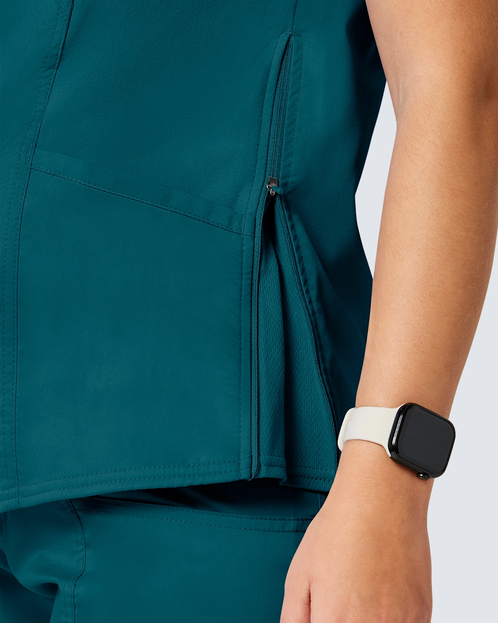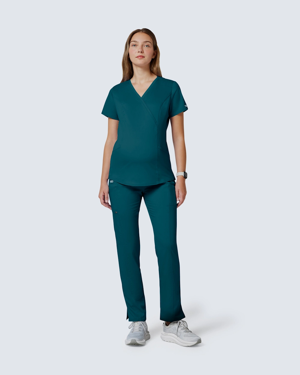 Mammatunikan med omlott-design är skapad för komfort och funktion under hela graviditeten. Den mjuka stickade panelen framtill och sidokilar med dragkedja och mesh erbjuder flexibel passform och plats att växa. Tunikan har två praktiska framfickor och genomtänkta sömmar fram och bak. Perfekt val för dig som vill kombinera stil, rörelsefrihet och funktion i vårdmiljö.