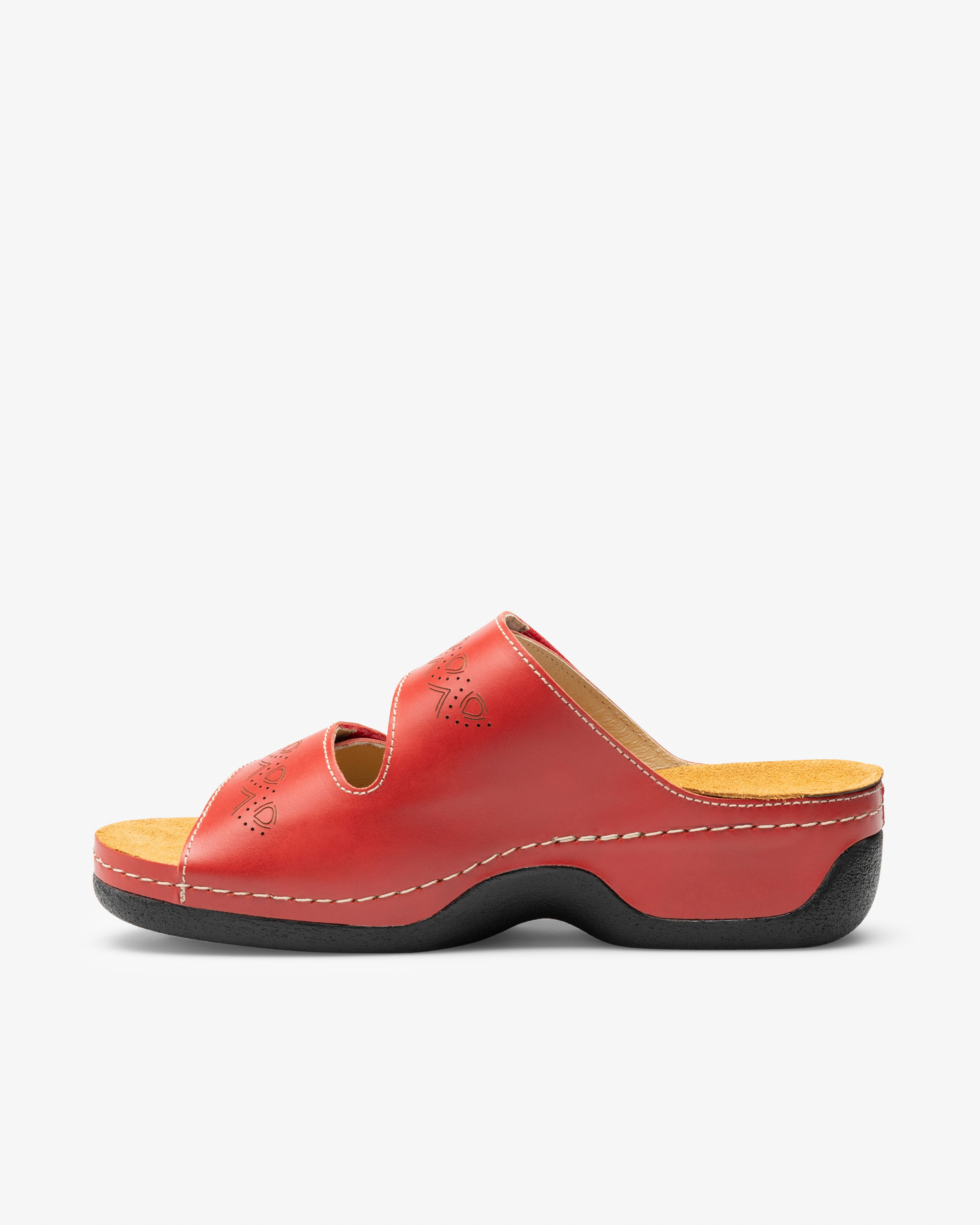 Mjuk skinnsandal i dammodell med utbytbar, ergonomisk fotbädd som ger stöd för hålfoten och lyfter framfotsvalvet. Sandalen har laserdekor och ljusa dekorsömmar. Justerbara remmar som tillåter dig att anpassa passformen efter just din fot. Yttersula i gummiblandning som greppar bra mot underlaget, vilket gör sandalen lämpad för både inomhus- och utomhusbruk.