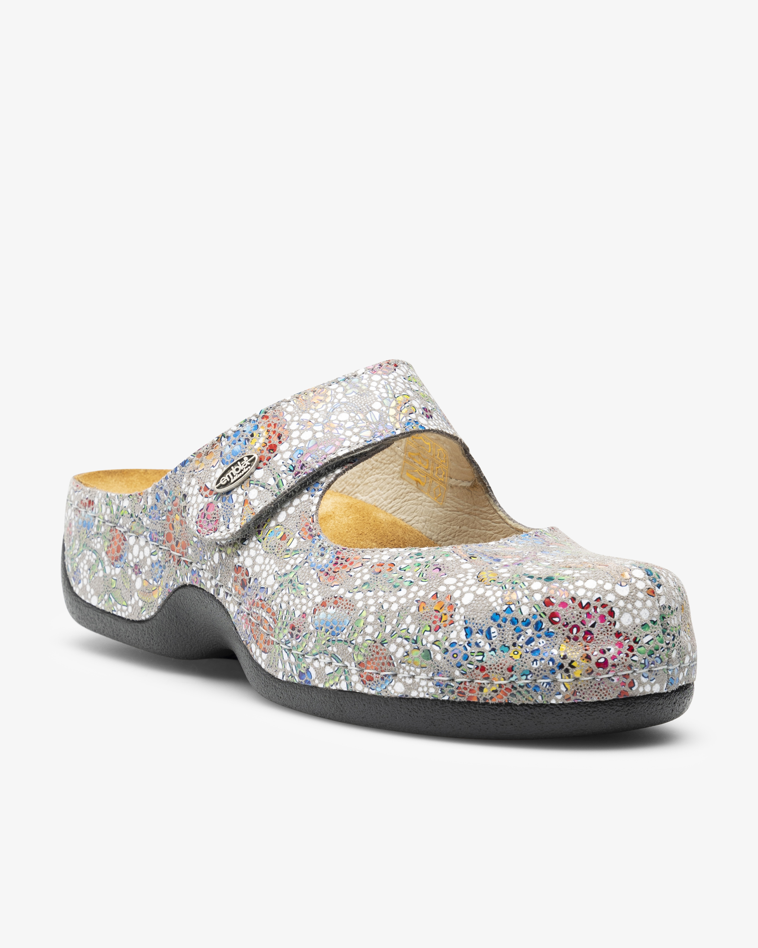 Toffel i dammodell med utbytbar, ergonomisk och mjukt sviktande fotbädd som erbjuder stöd för hålfoten och lyfter framfotsvalvet. Denna toffel i skinn har en justerbar vristrem med kardborre. Yttersula i gummiblandning som greppar bra mot underlaget, vilket gör skon lämpad för både inomhus- och utomhusbruk.