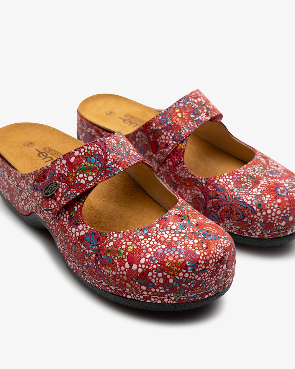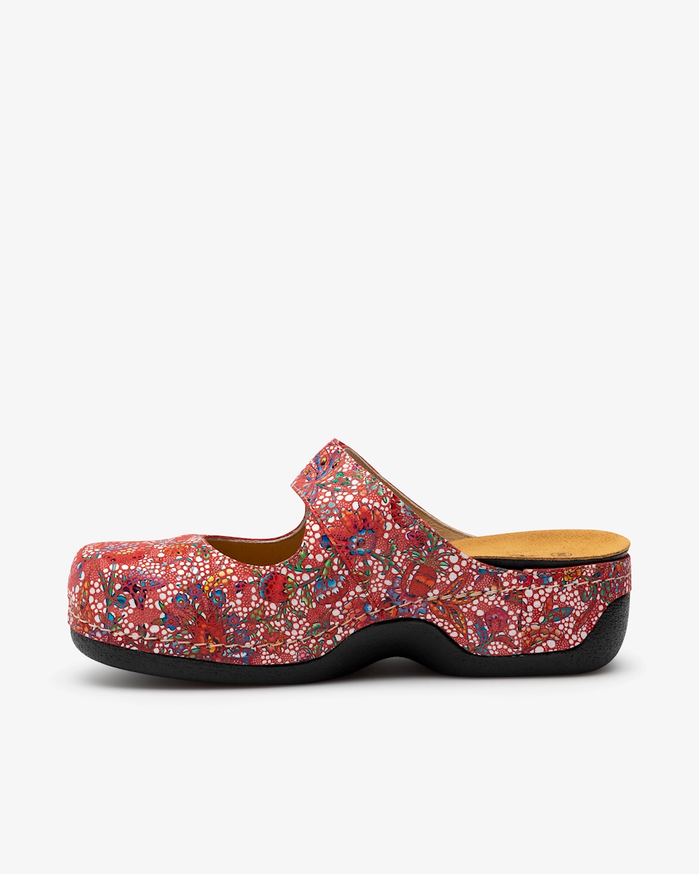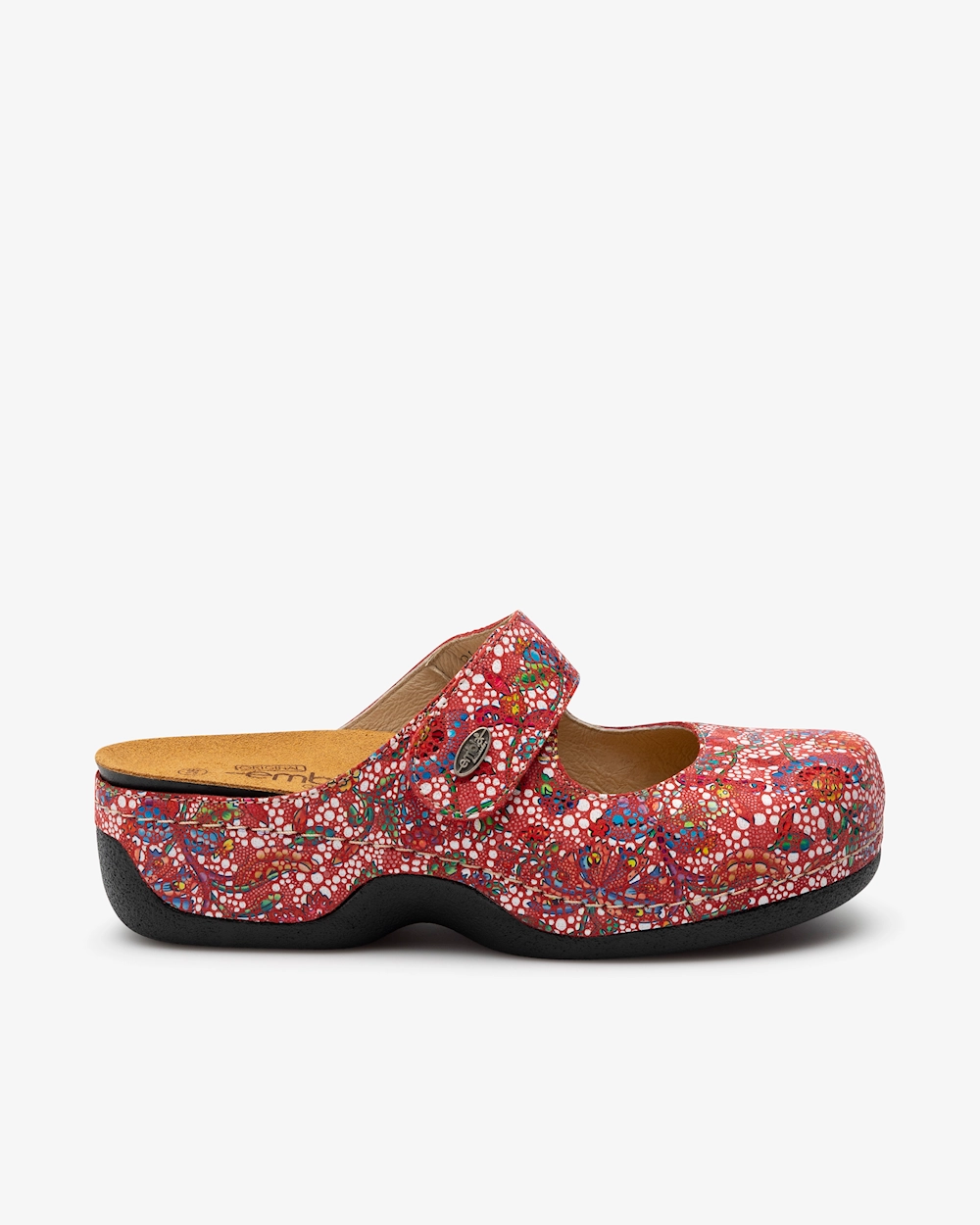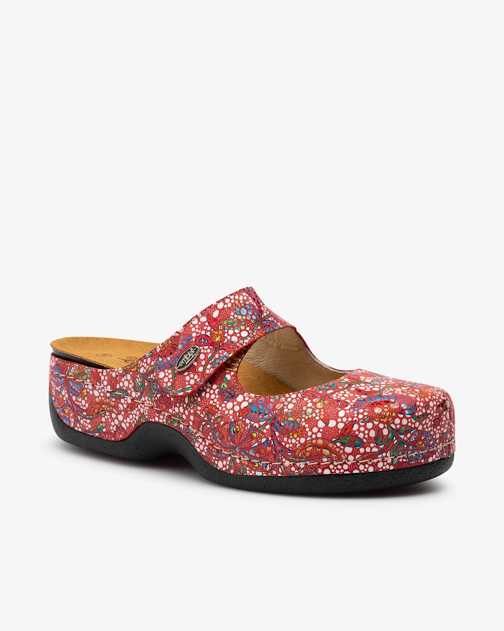 Toffel i dammodell med utbytbar, ergonomisk och mjukt sviktande fotbädd som erbjuder stöd för hålfoten och lyfter framfotsvalvet. Denna toffel i skinn har en justerbar vristrem med kardborre. Yttersula i gummiblandning som greppar bra mot underlaget, vilket gör skon lämpad för både inomhus- och utomhusbruk.