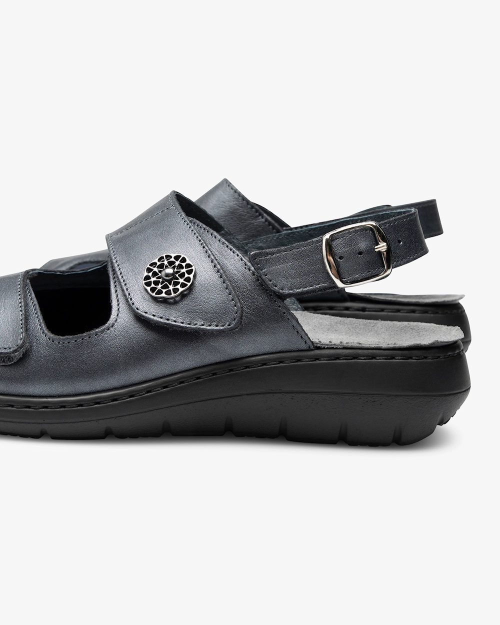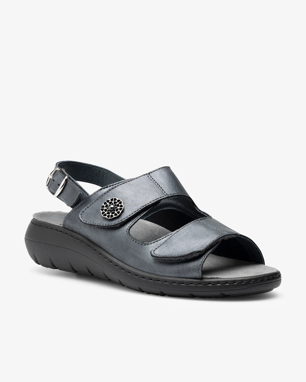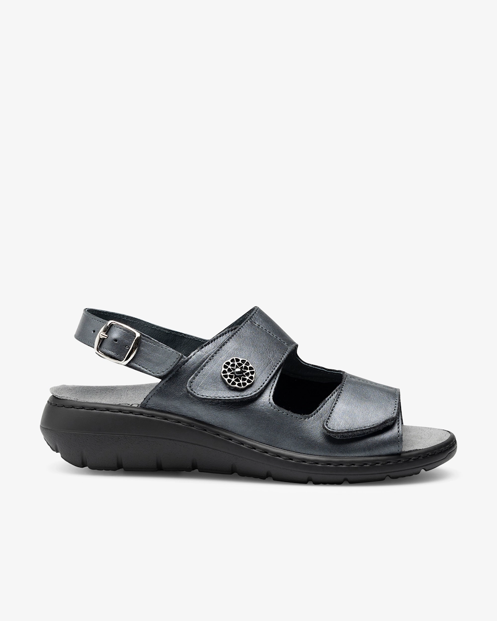 Mjuk damsandal i skinn med utbytbar, ergonomisk fotbädd som ger stöd för hålfoten och lyfter framfotsvalvet. Sandalen är skinnfodrad och har justerbara remmar med kardborre. Perfekt för dig som lätt blir trött i fötterna och är i behov av en luftig och mjuk sandal som erbjuder gott om stöd.
