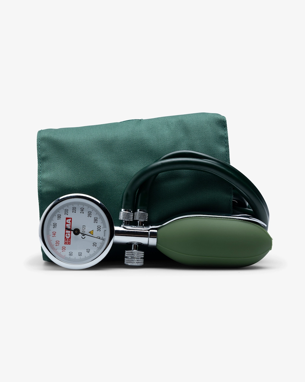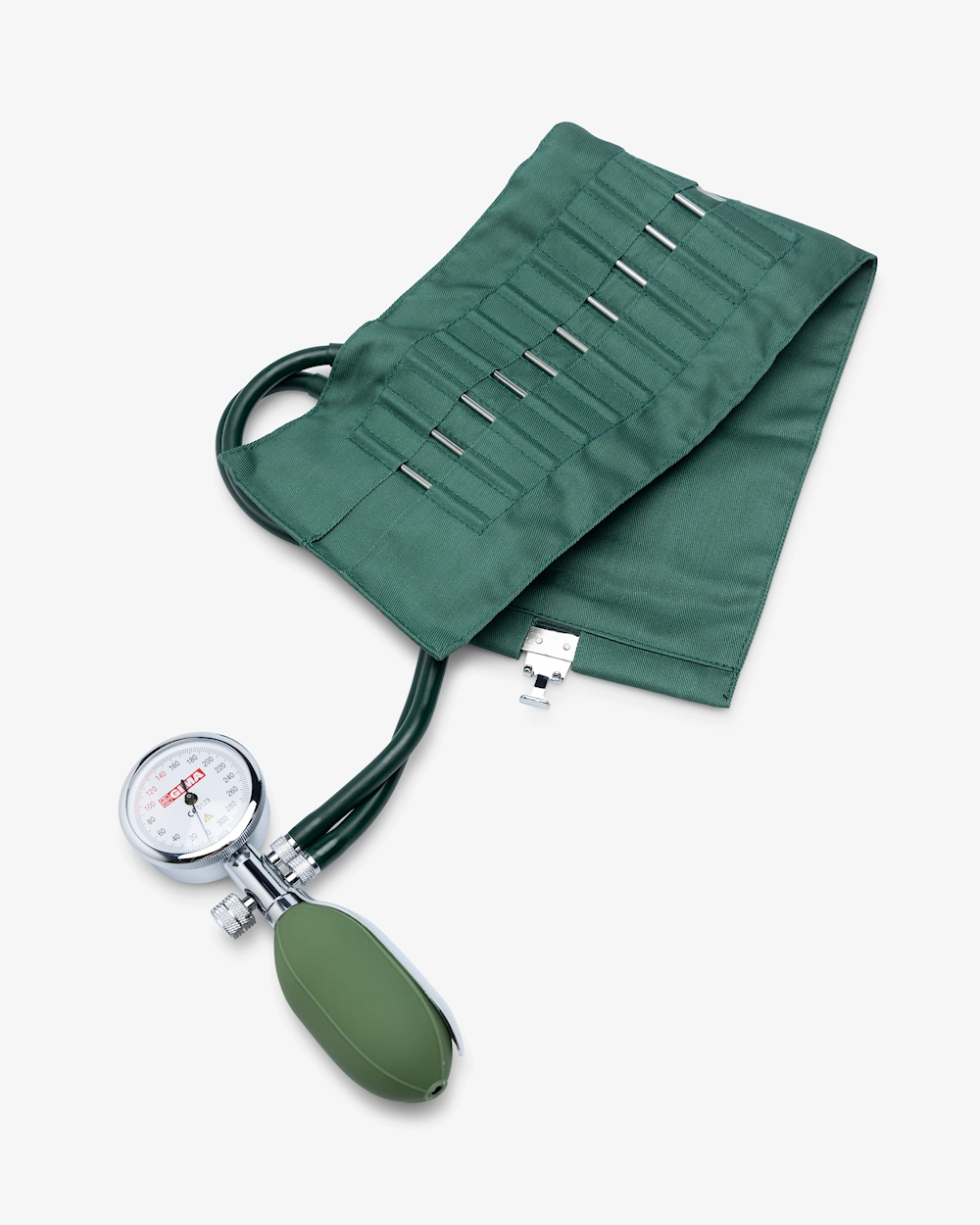 Traditionell aneroid blodtrycksmätare med moderna funktioner och hög kvalitet. Denna modell har en grön bomullsmanschett med hake.