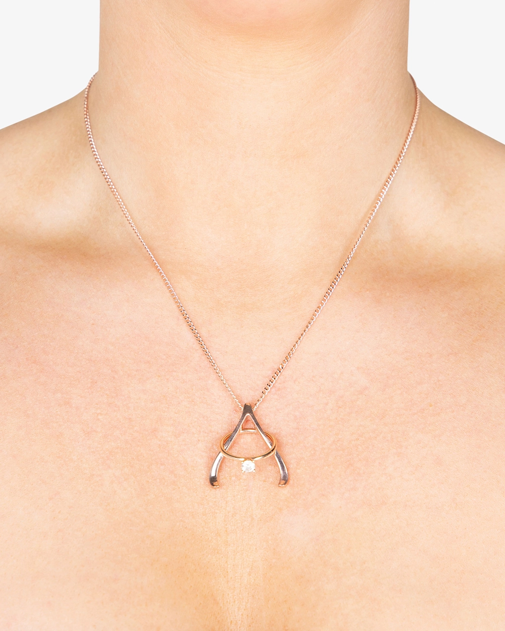Halsband i rosé med hänge, där du smidigt och tryggt kan förvara din ring när du inte kan eller får ha den på fingret. Halsbandet är allergivänligt och tillverkat i 925 silver, pläterat i 18K Roséguld.