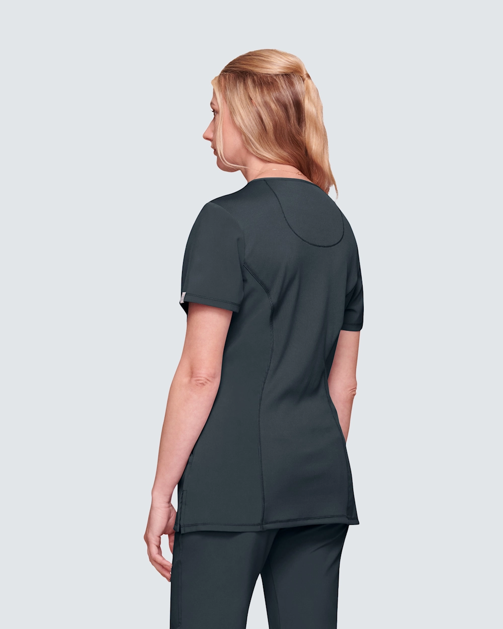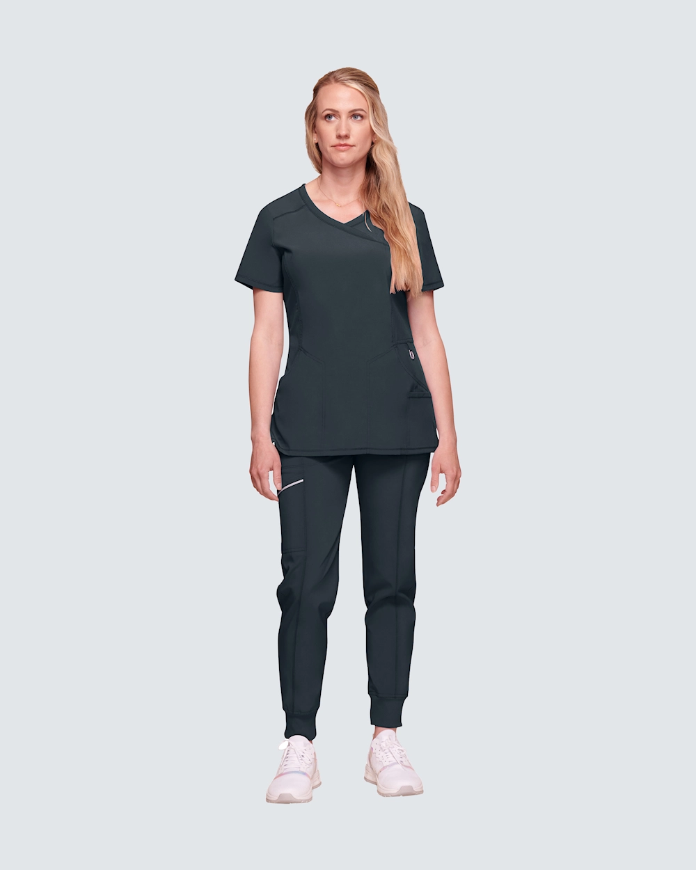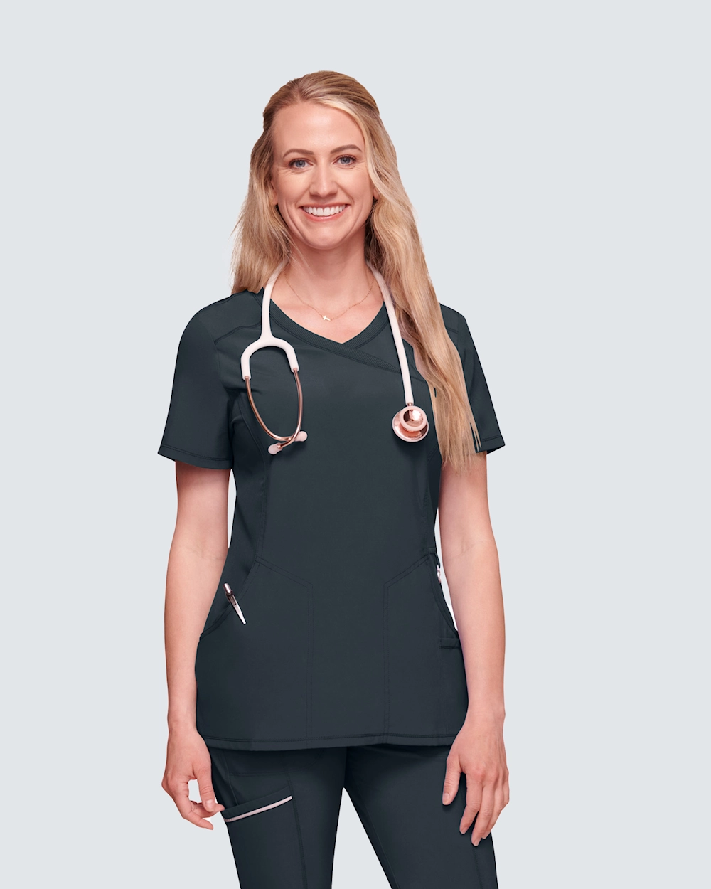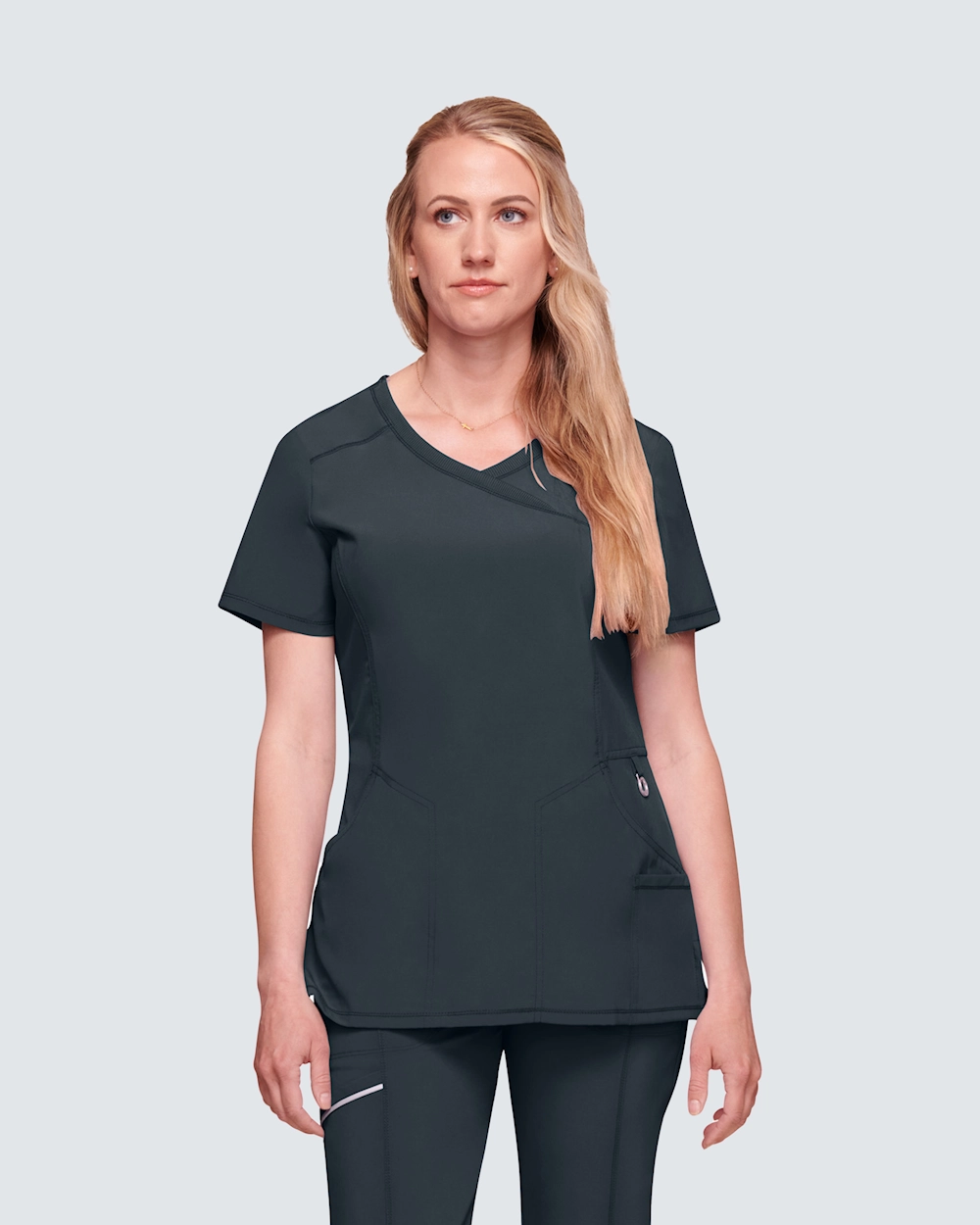 Den moderna damtunikan i omlottmodell kombinerar stil och funktionalitet för det professionella vårdteamet.