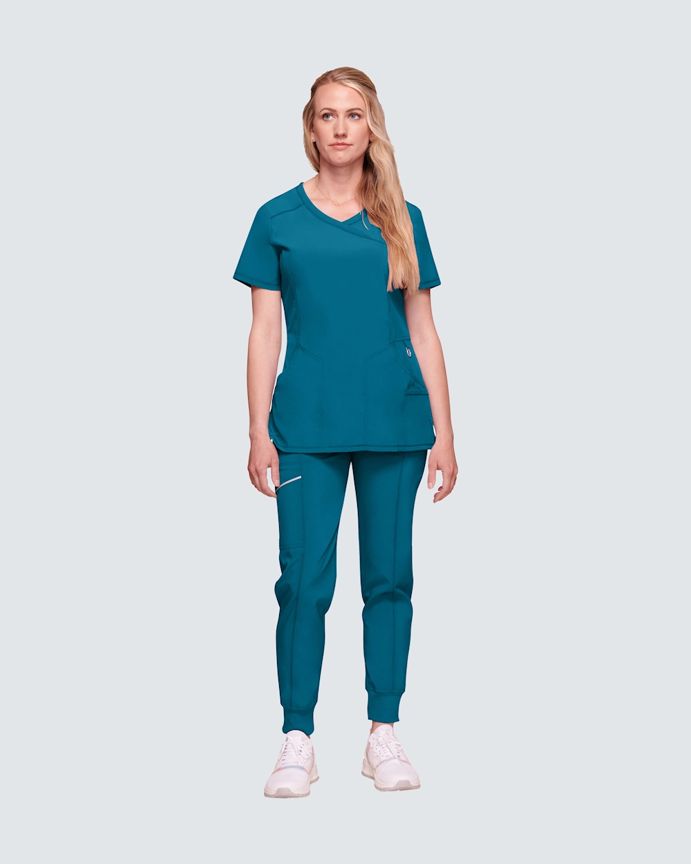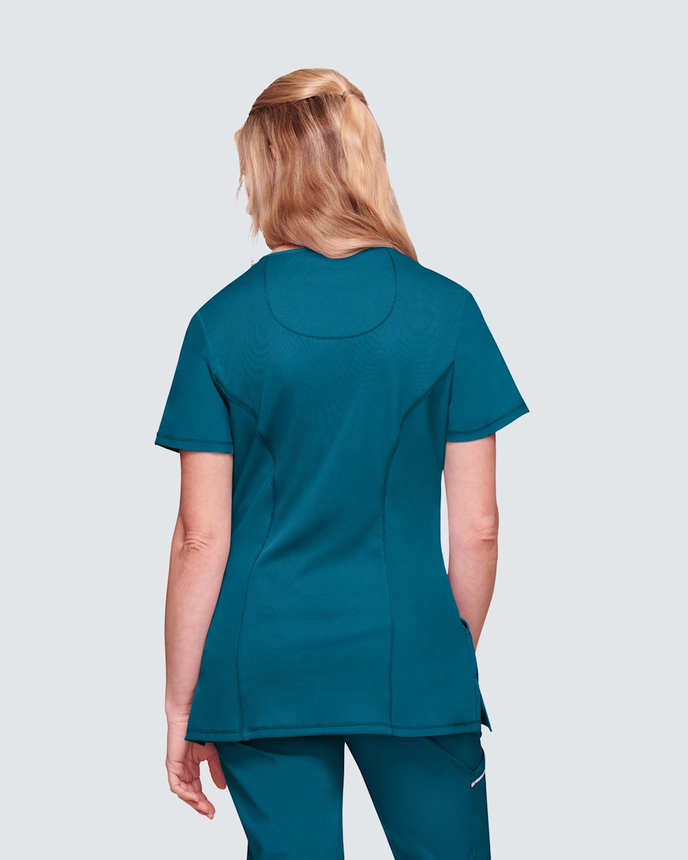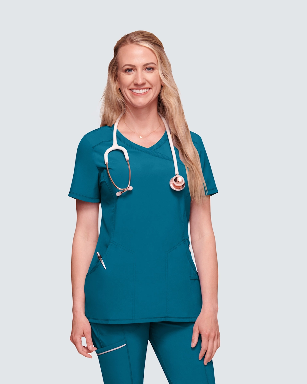 Den moderna damtunikan i omlottmodell kombinerar stil och funktionalitet för det professionella vårdteamet.