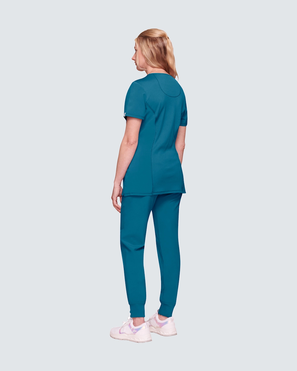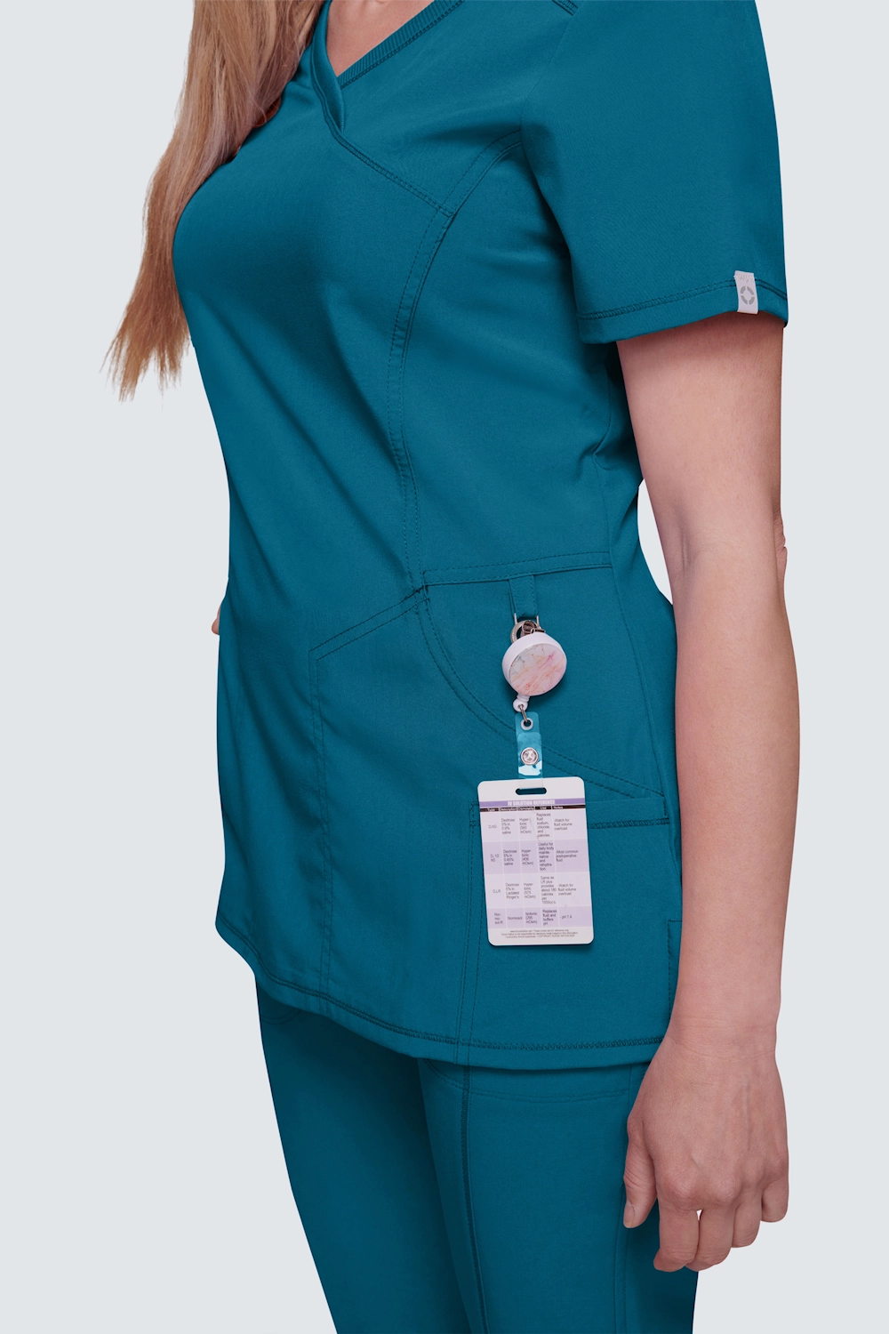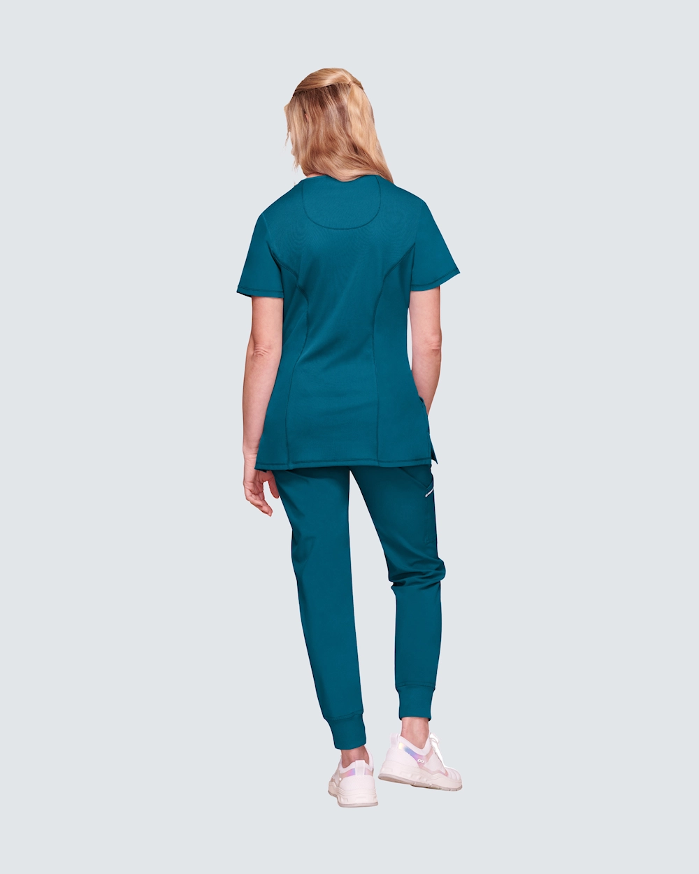 Den moderna damtunikan i omlottmodell kombinerar stil och funktionalitet för det professionella vårdteamet.