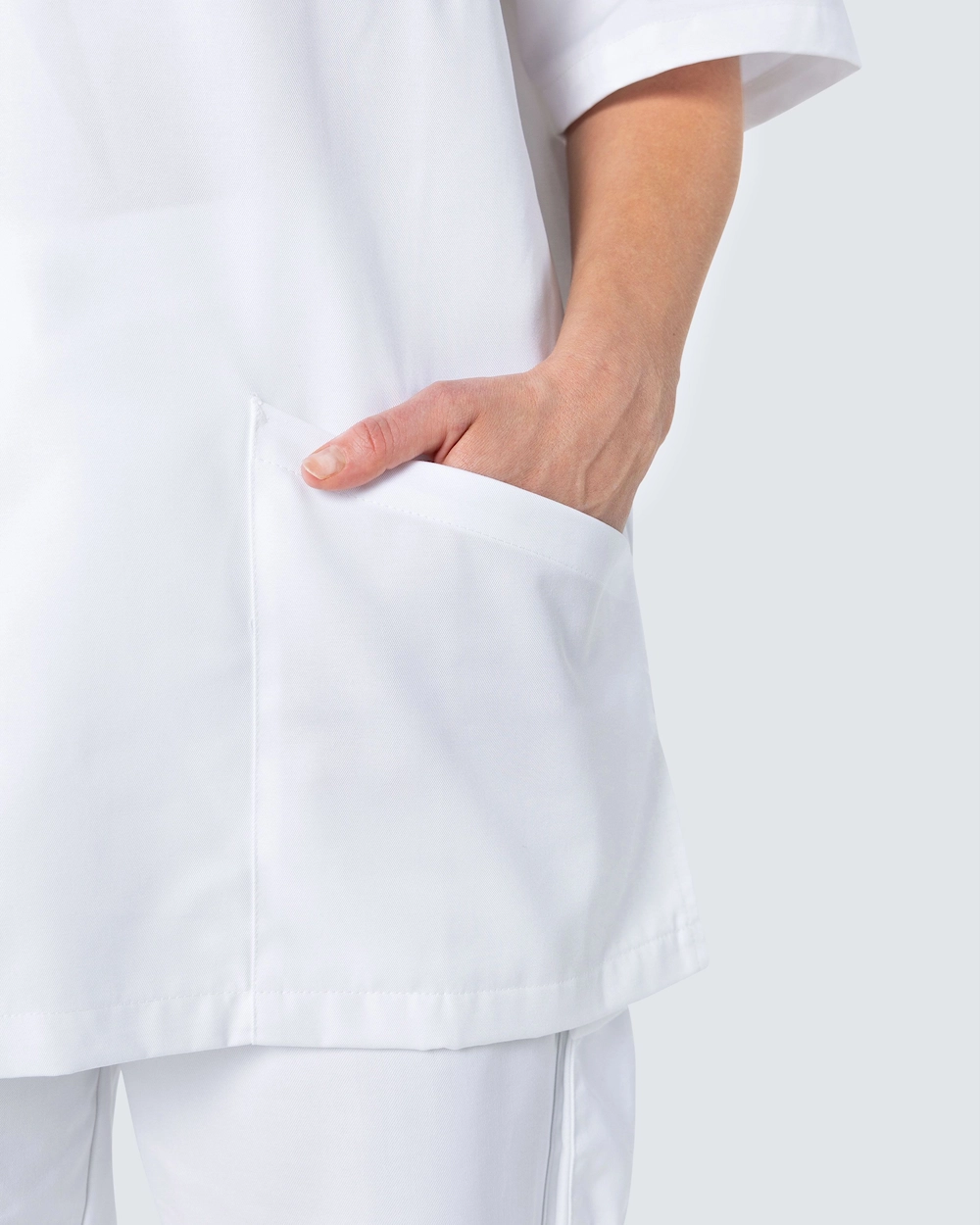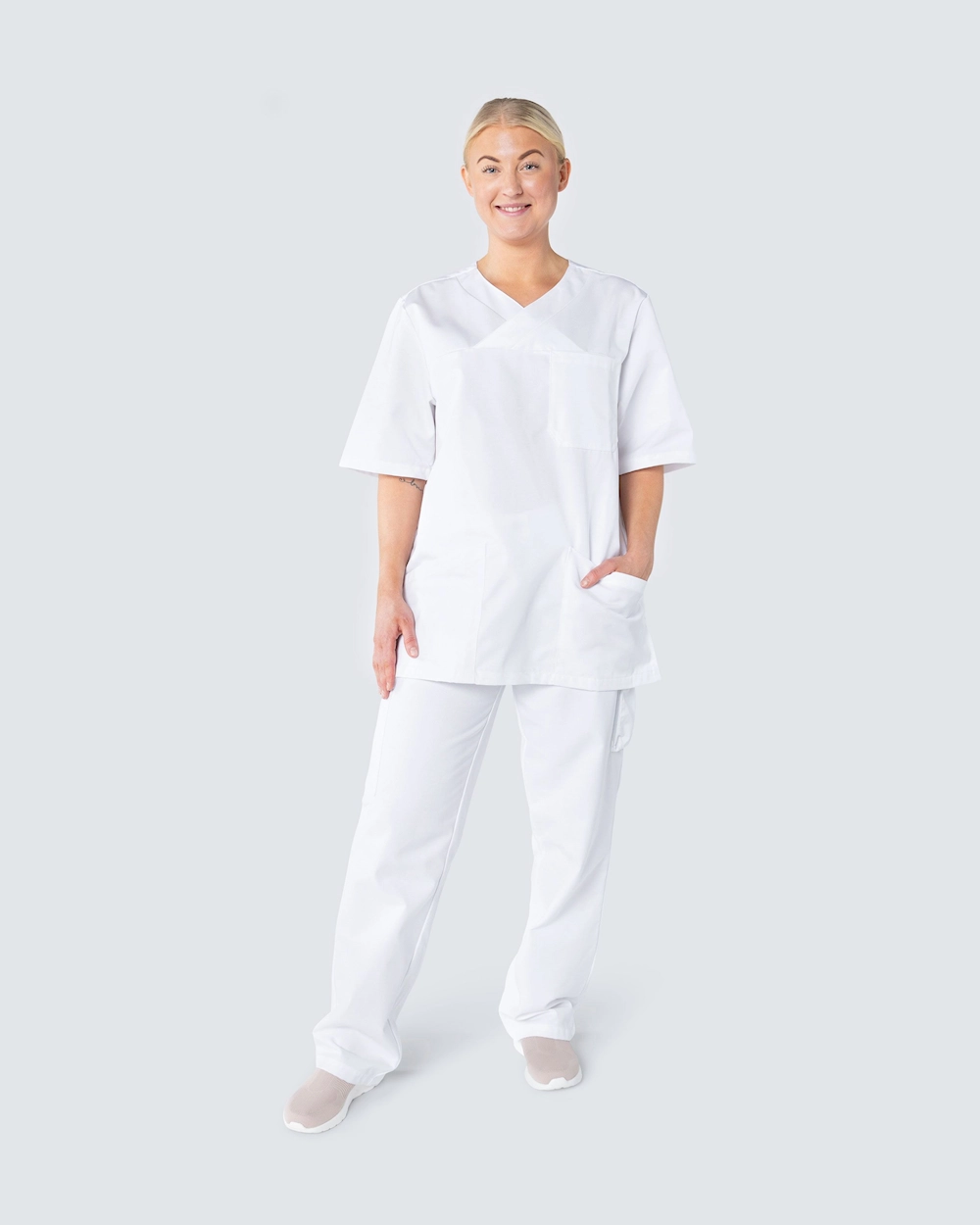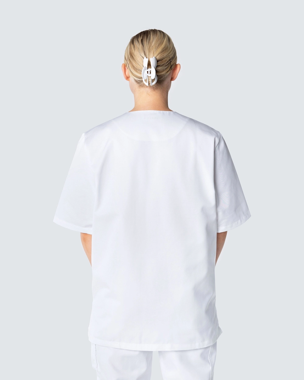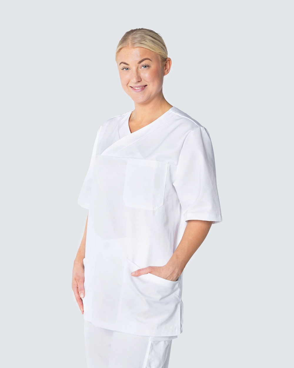 Skön och rymlig bussarong i polyester/bomullsblandning. Med praktiska och rymliga fickor får du enkelt plats med det du behöver ha med dig under ett arbetspass. De två fickorna framtill är snedskurna vilket ger en fin detalj på bussarongen.