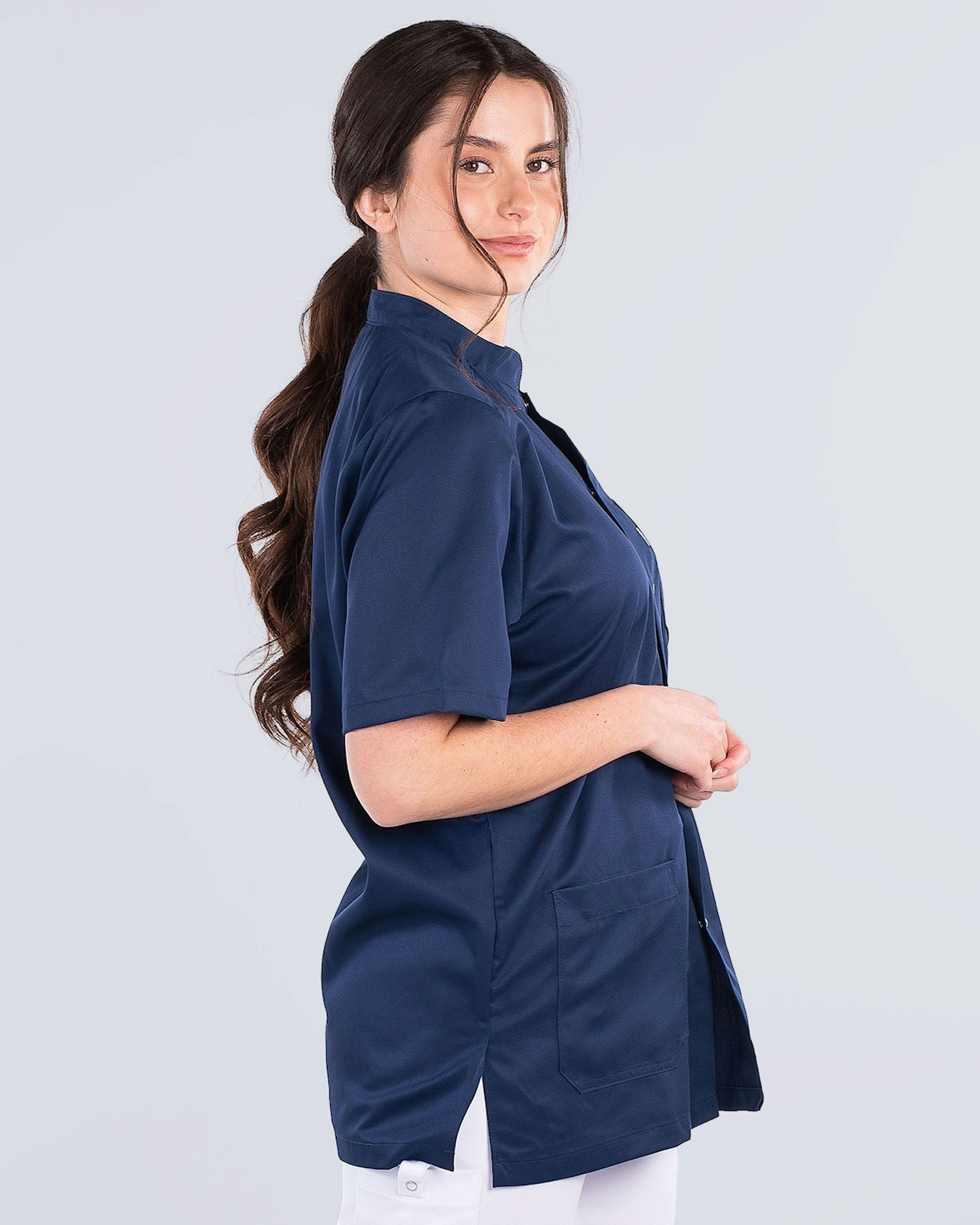 Kortärmad arbetsskjorta i skön och miljövänlig Tencel som bidrar med en sval och luftig känsla och hög komfort. Knappslå med tryckknappar och en dekoraiv ståkrage ger en fin detalj. Skjortan har både bröstficka och höftfickor med gott om plats för diverse arbetsredskap. Skjortan är sydd i rak unisexmodell och med den invändiga midjejusteringen i ryggen kan du enkelt anpassa passformen om du önskar en mer formande skjorta.