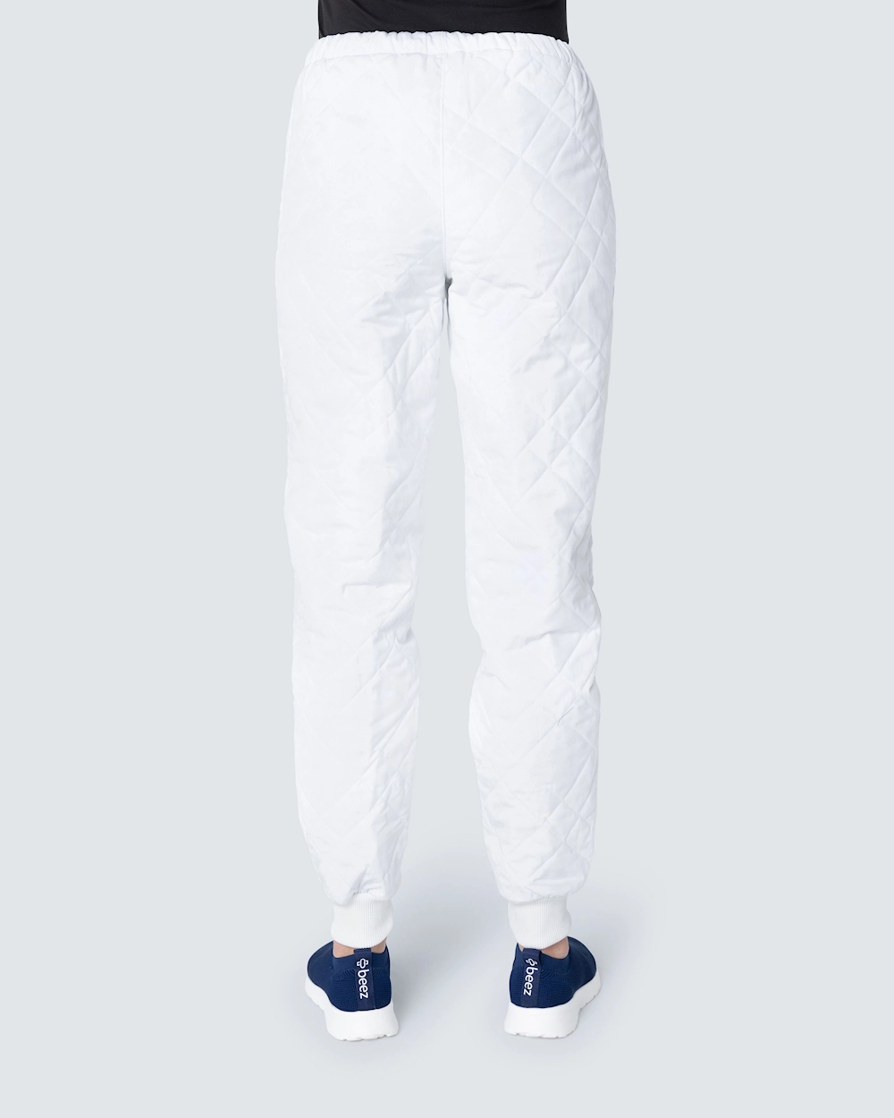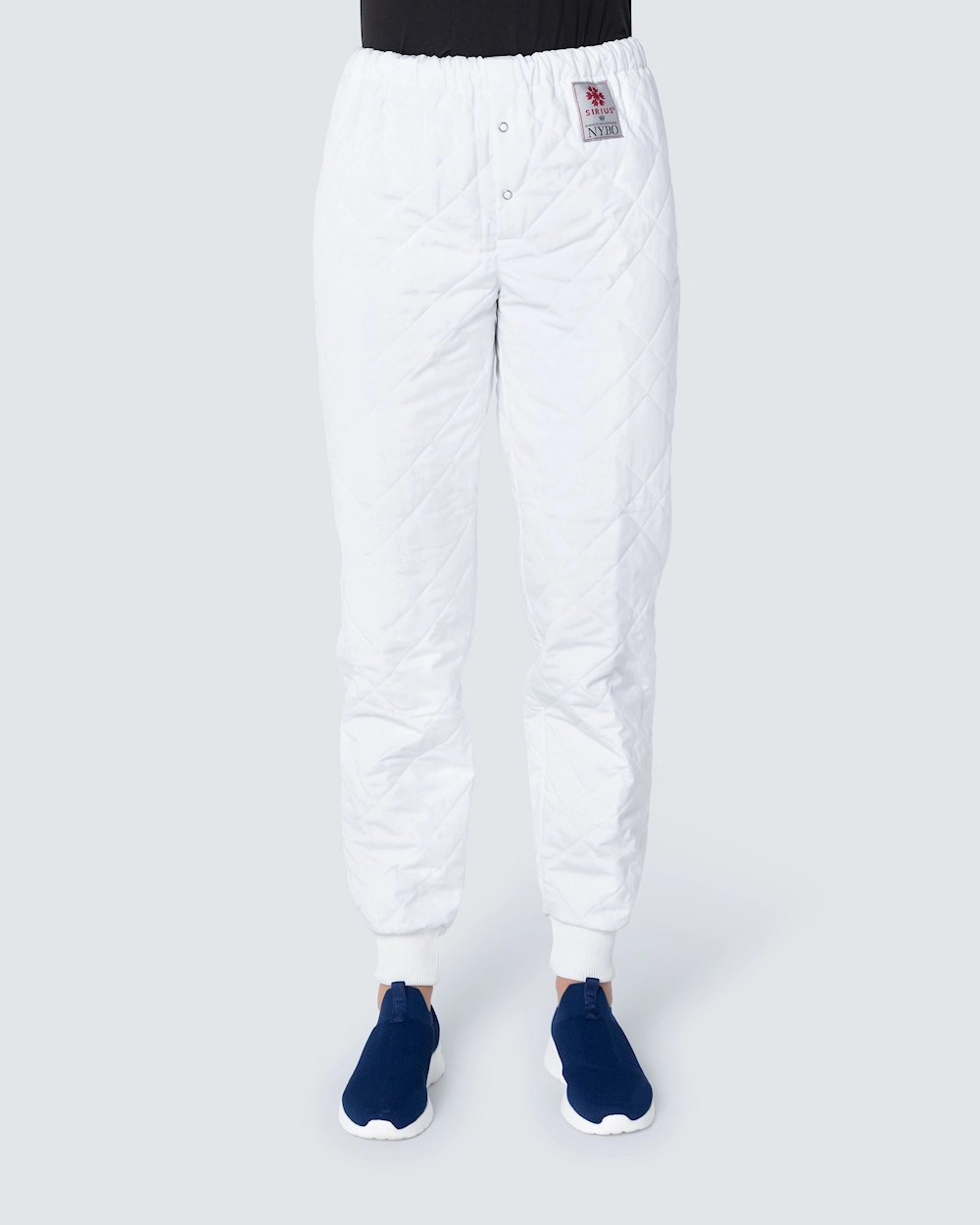 Funktionella quiltade termobyxor med elastiskt midjeband. Byxorna stängs med gylf och tryckknapp och har mudd i bensluten.