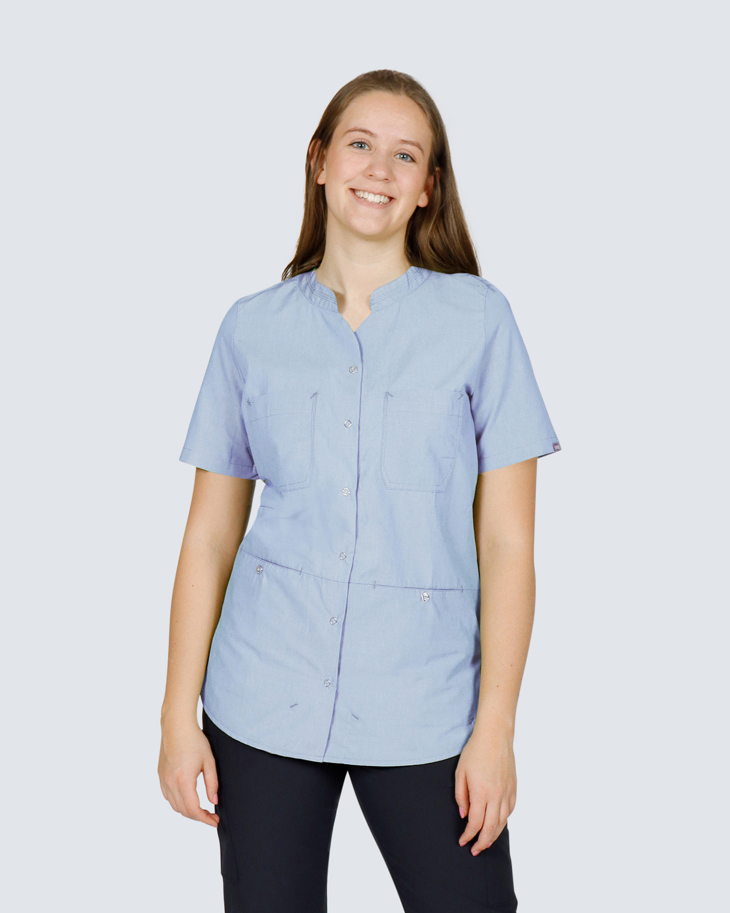 Vårdtunika i dammodell med stilren ståkrage. Tunikan har flera rymliga fickor med gott om förvaring. Stretch bak i ryggen ger en god rörelsevidd och skön passform. Hel knappslå med tryckknappar är praktiskt för dig med ett arbete med mycket smuts och spill, och inte vill dra arbetströjan över huvudet.