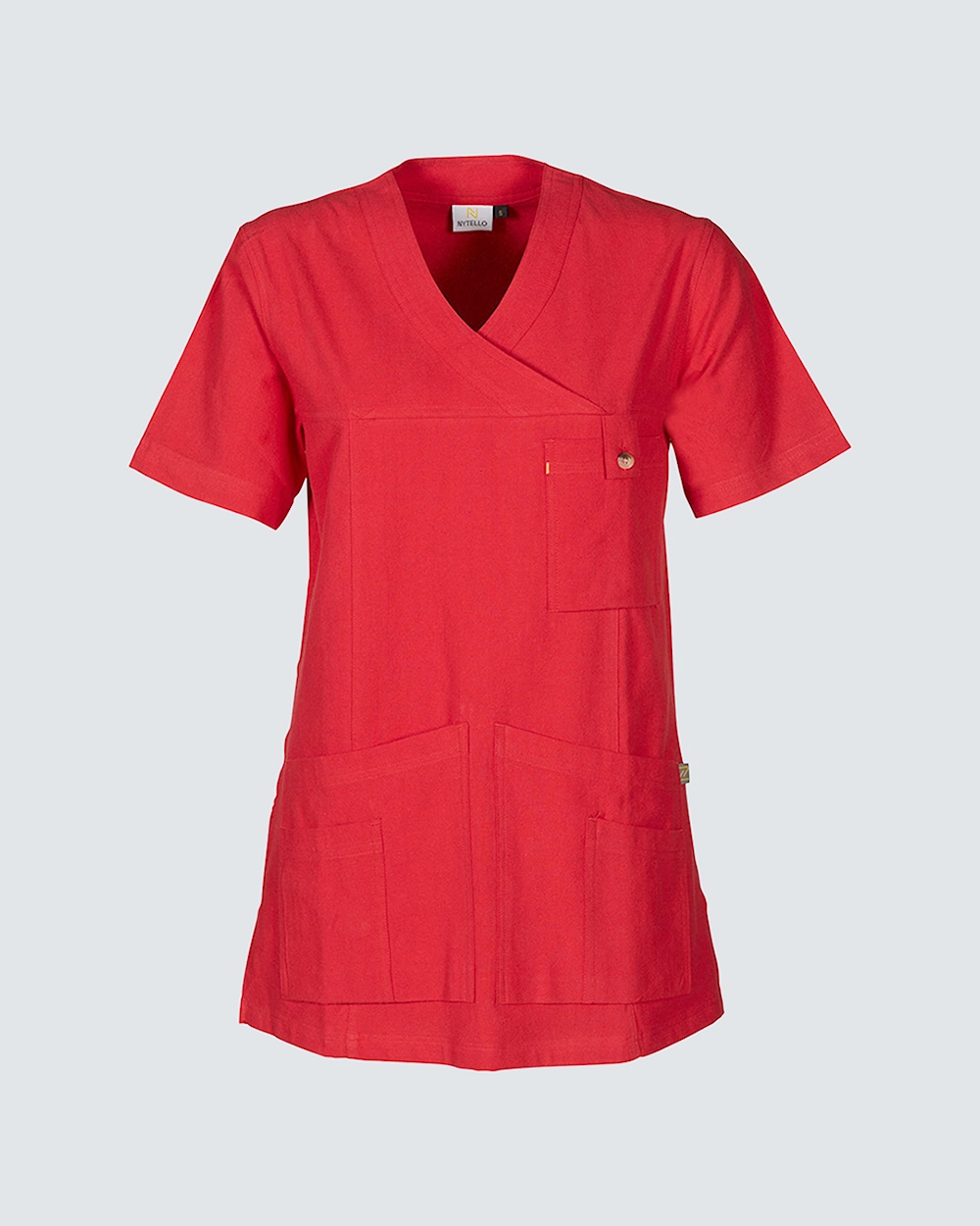 Med en smickrande V-ringning och korta ärmar erbjuder den komfort under hela skiftet.