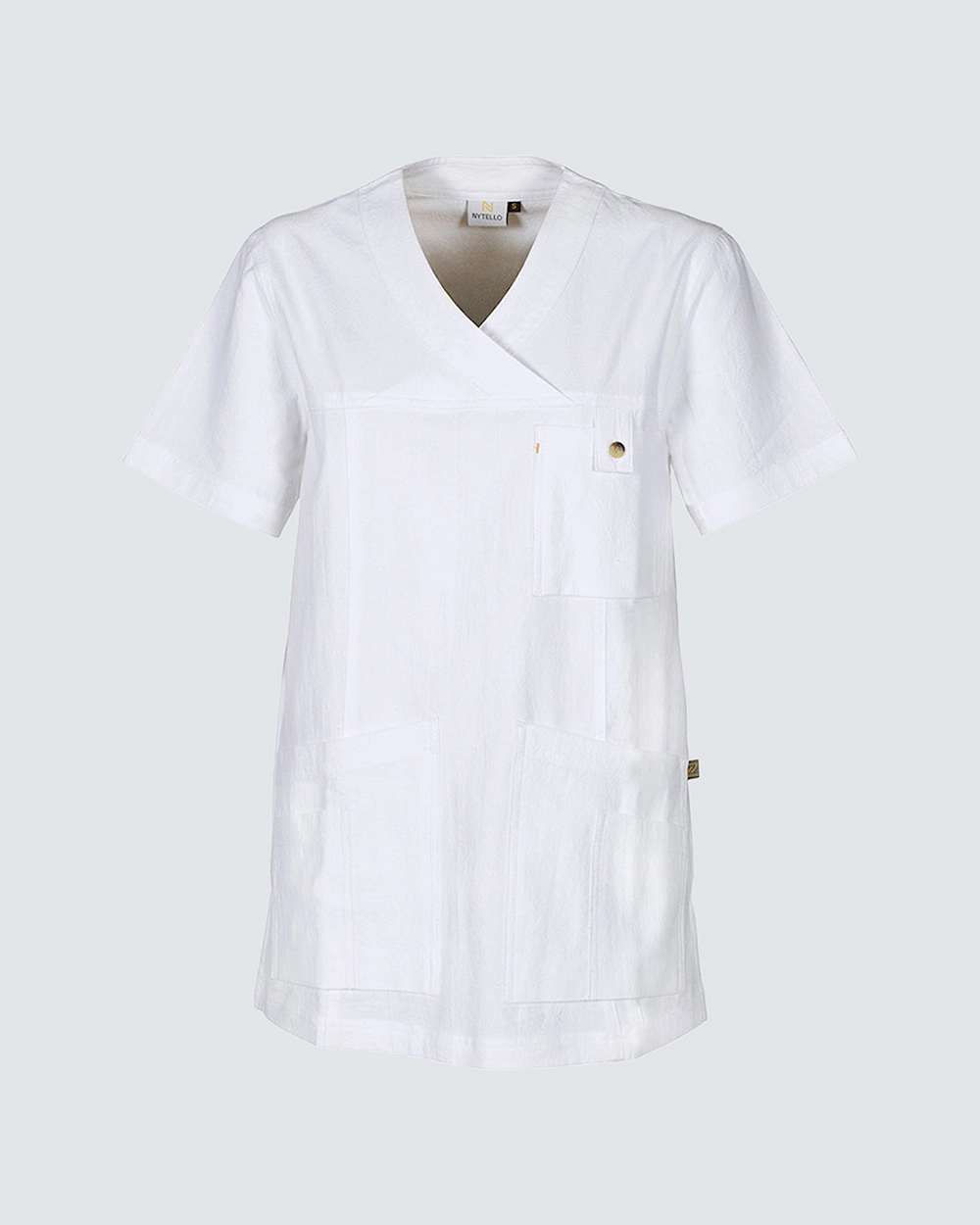 Med en smickrande V-ringning och korta ärmar erbjuder den komfort under hela skiftet.