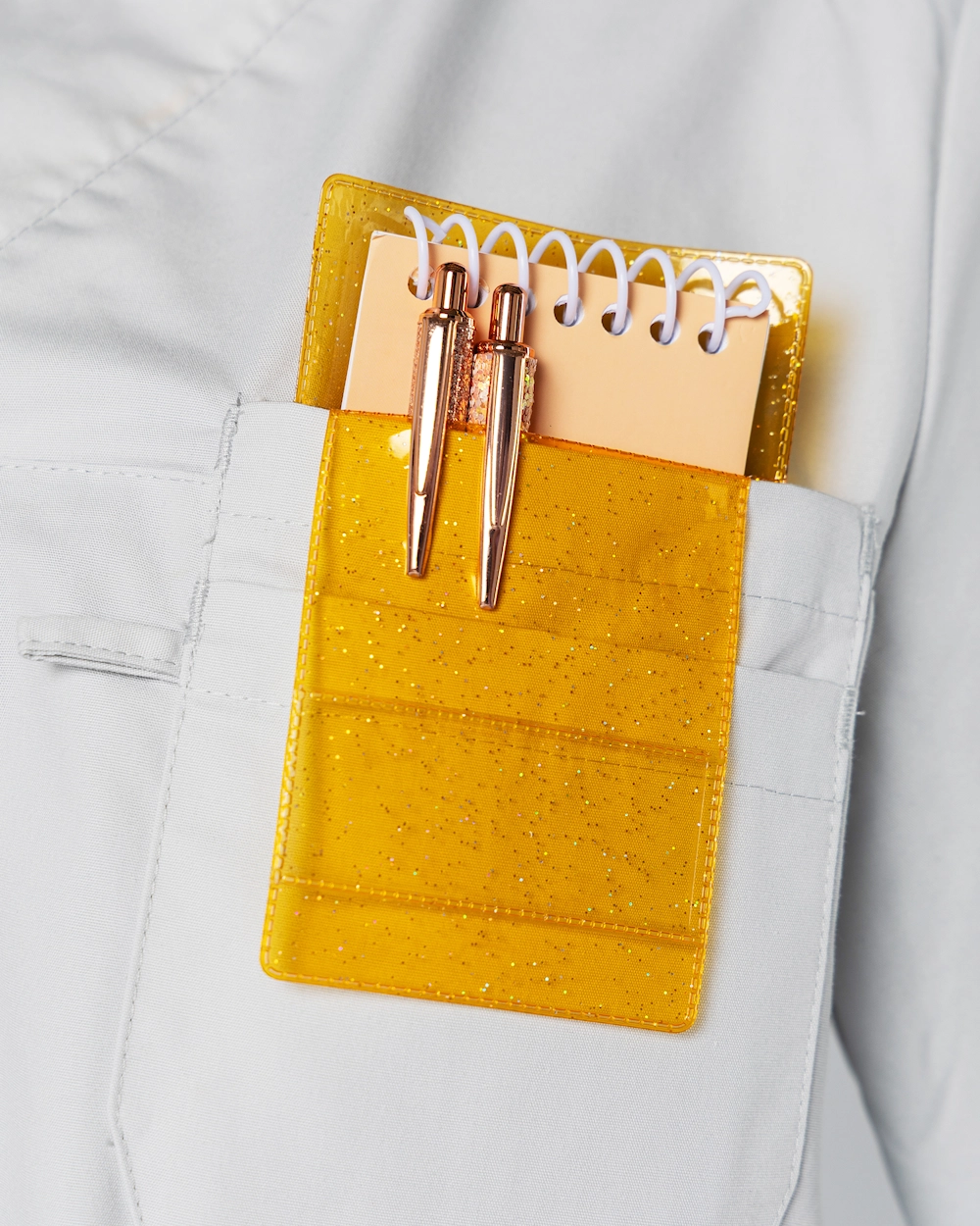 Pennficka i glitter som ser till att dina pennor inte försvinner samtidigt som den skyddar dina plack mot bläckläckage. Ett snyggt sätt att alltid ha en penna nära till hands. På pennfickans framsida finns även en ficka perfekt för namnskylten.