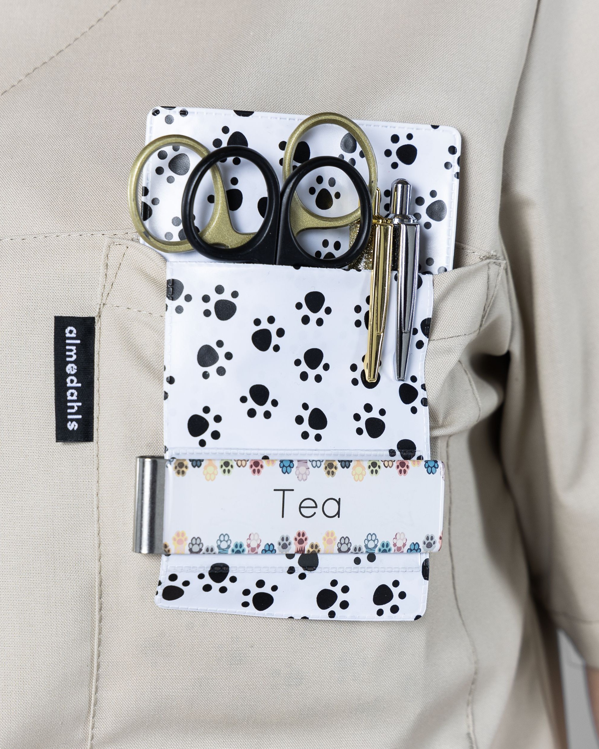 En färgglatt mönstrad pennficka i plast som ser till att dina pennor inte försvinner samtidigt som du skyddar dina plagg mot bläckläckage. Ett snyggt sätt att alltid ha en penna nära till hands. På framsidan av pennfickan finns en ficka för namnskylt. Matcha gärna med övriga produkter i vårt sortiment som är tassmönstrade.