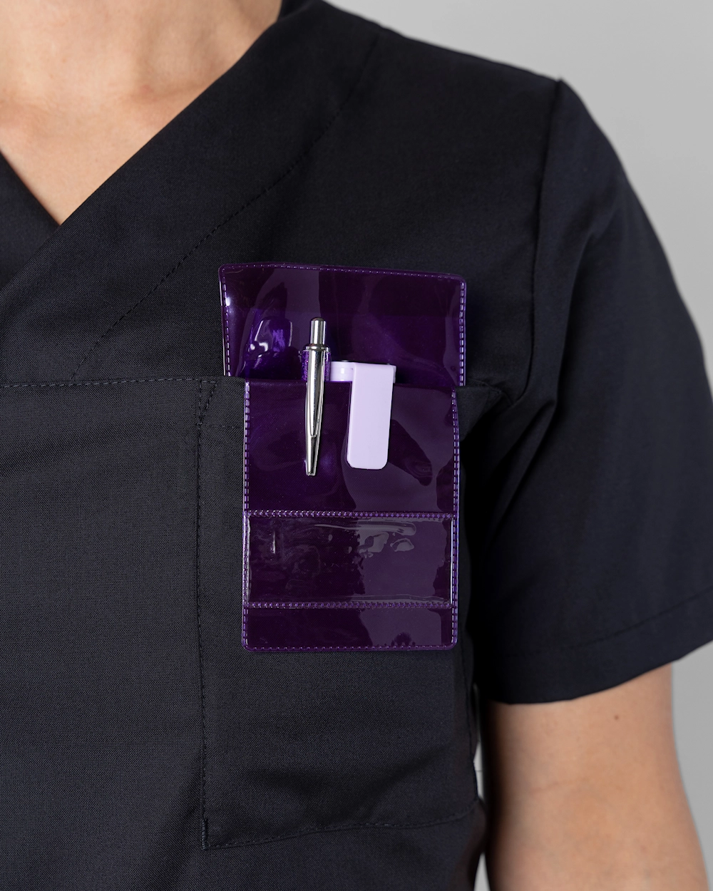 En färgglad pennficka i plast som ser till att dina pennor inte försvinner samtidigt som du skyddar dina plagg mot bläckläckage. Ett snyggt sätt att alltid ha en penna nära till hands. På framsidan av pennfickan finns en ficka för namnskylt.