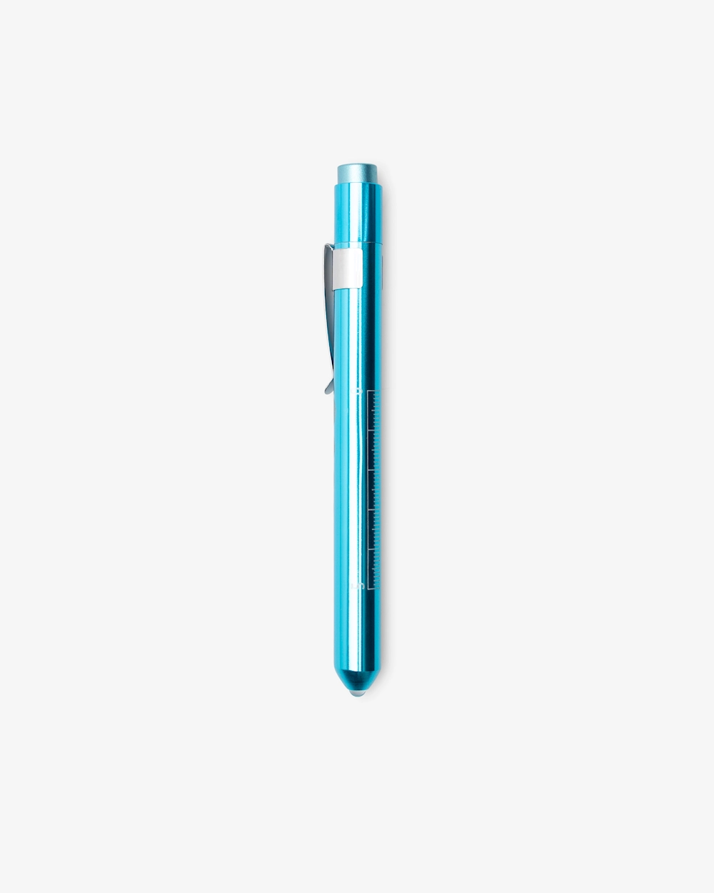 Praktisk pennlampa för ögonundersökningar, med pupillmätare (2-9 mm) och avståndsmätare (0-50 mm). Lampan är 13 cm lång och 1,2 cm i diameter, utrustad med en LED-lampa. Batteri: 2 x AAA (ingår ej).