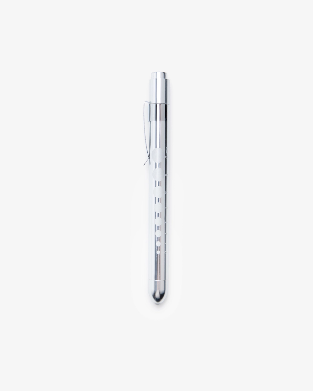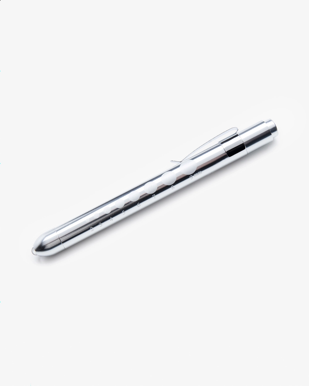 Praktisk pennlampa för ögonundersökningar, med pupillmätare (2-9 mm) och avståndsmätare (0-50 mm). Lampan är 13 cm lång och 1,2 cm i diameter, utrustad med en LED-lampa. Batteri: 2 x AAA (ingår ej).