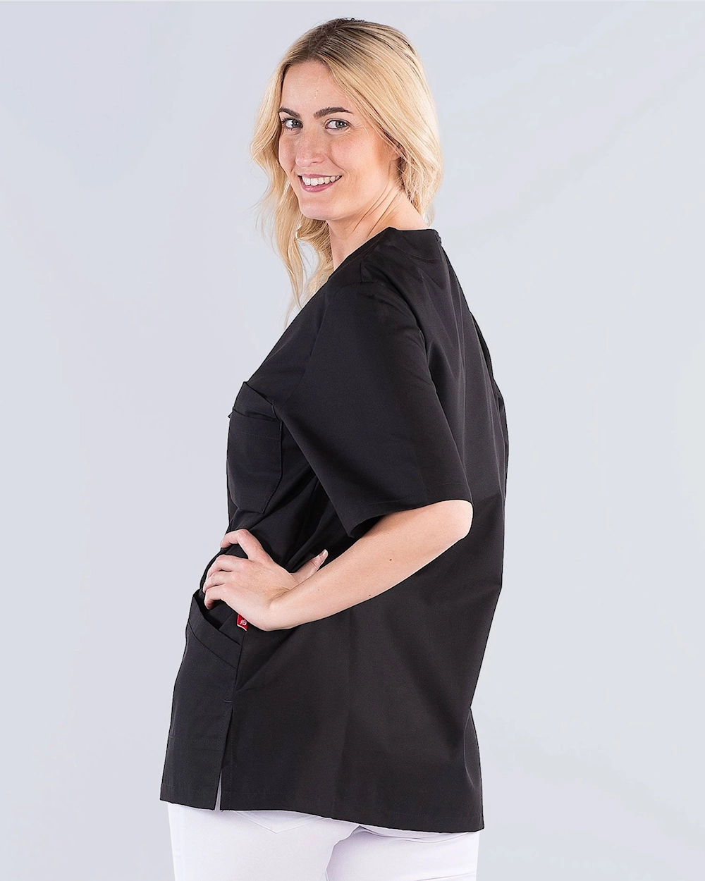 Denna sköna vårdtunika är tillverkad i miljövänlig Tencel som ger en lätt och skön känsla på kroppen, andas bra och ger samtidigt en hög komfort. Tunikan har två snedställda framfickor med nyckehälla och telefonficka samt en bröstficka för förvaring av pennor och block. Sprund i sidan ger god rörelsevidd.
