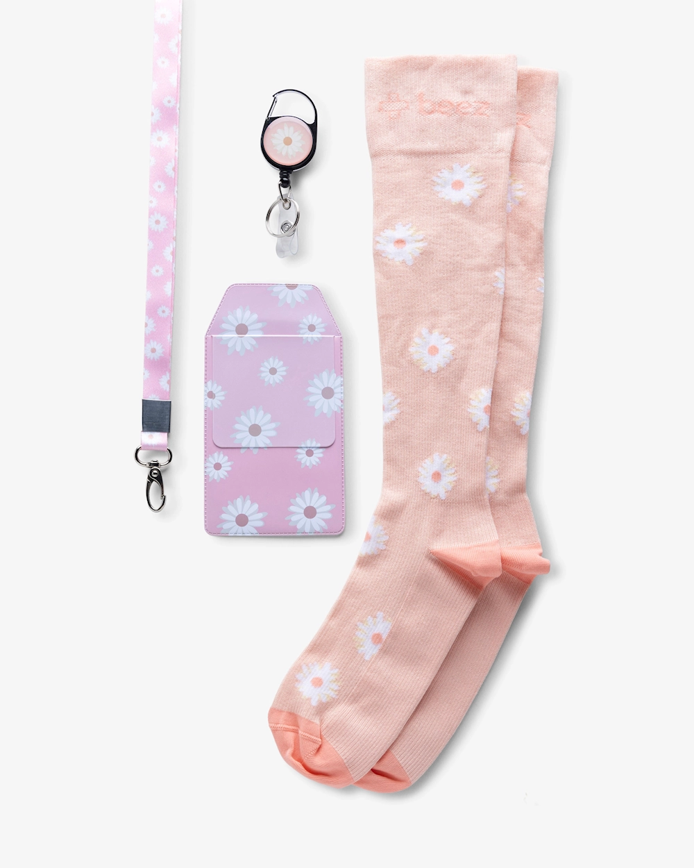 Låt arbetsglädjen spira med "Stödstrumpor Kit Daisy". Detta söta set går i rosa toner och innehåller stödstrumpan Daisy som motverkar svullna och trötta ben. Med tillhörande blommig pennficka, nyckelband och korthållare har du alltid dina viktigaste redskap nära till hands på ett snyggt och organiserat sätt.