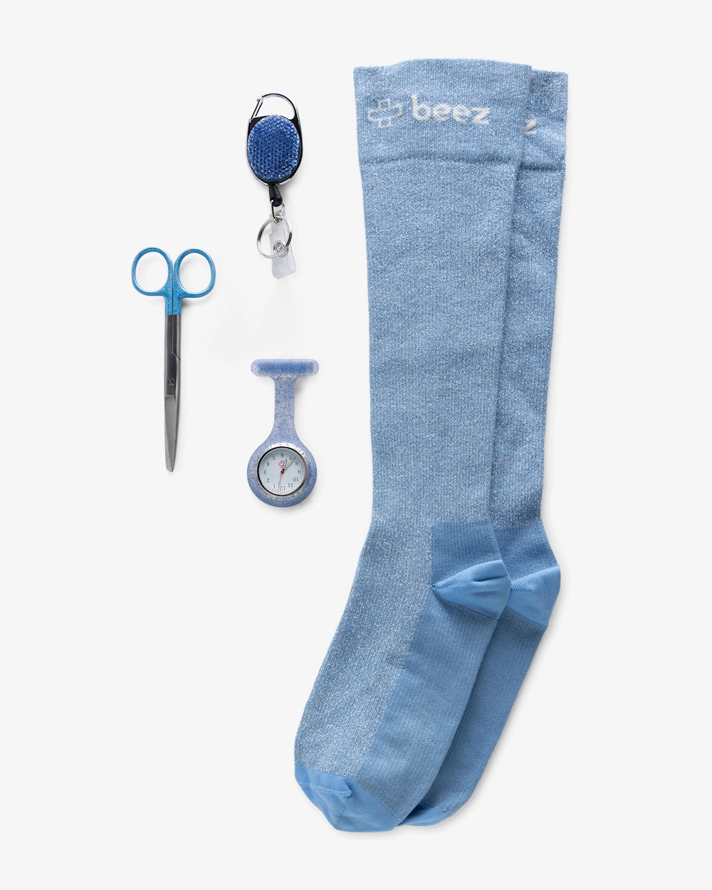 Liva upp arbetsdagen med "Stödstrumpor Kit Glitter Blå". Ett fräscht och funktionellt set som ger dig verktygen du behöver. Utöver stödstrumpan Velma i ljusblått glitter ingår en praktisk detaljsax, ett systerur med blått glitterskal och en läcker jojo i Ice Blue. Allt du behöver för att hålla koll på tid, hygien och patienter.