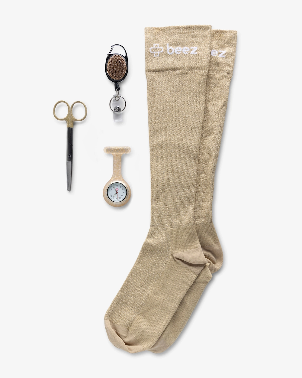 Sätt guldkant på vårdvardagen med vårt exklusiva "Stödstrumpor Kit Glitter Guld". Detta omfattande set innehåller inte bara den glittriga stödstrumpan Velma för trötta ben, utan även ett komplett systerur med silikonskal, en praktisk detaljsax och en matchande jojo – allt i ett lyxigt guldtema.