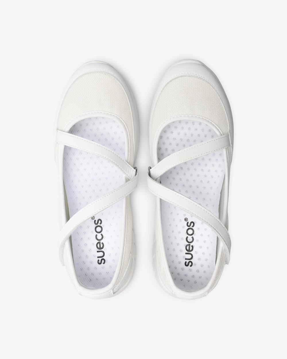 Lätt, smidig och ergonomisk utformad ballerinasko i sportig dammodell. Med sin tidlösa och stilrena design passar denna sko lika väl på jobbet som på fritiden. Hög andningsförmåga, vilket skapar en sval och behaglig miljö för dina fötter. Uttagbar innersula och halksäker yttersula. Justerbara kardborreremmar som möjliggör anpassningsbar passform. Denna sko har stötdämpande egenskaper och bredare häl för extra stabilitet. Enkel att rengöra med tvål och vatten.