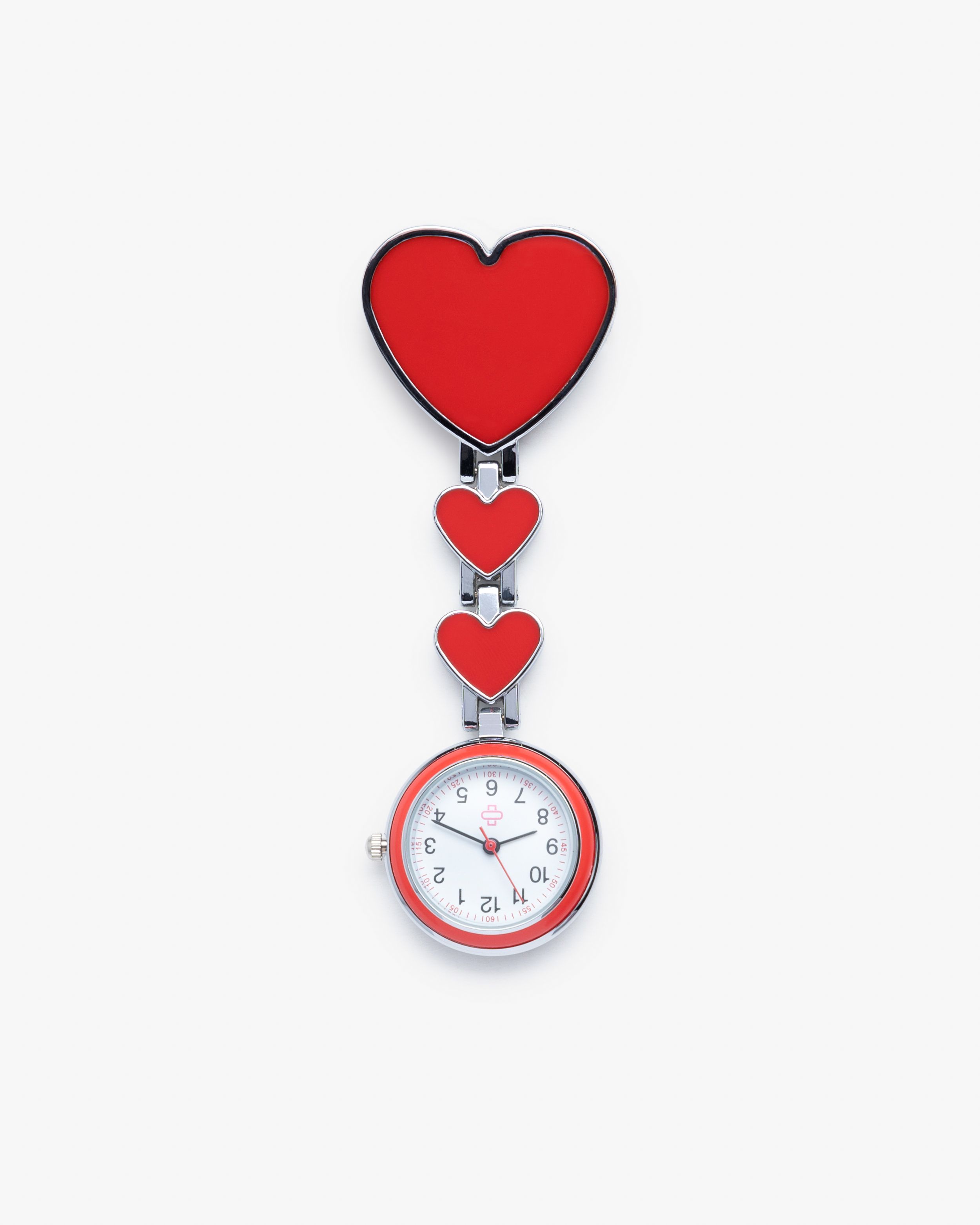 Denna snygga sjuksköterskeklocka hjälper dig hålla enkelt koll på tiden, räkna sekunder och hålla rätt på tidtagning vid omvårdnad och behandlingar. Klockan har en fin länk i rostfritt stål med tre hjärtan; ett större hjärta och två mindre och kan smidigt rengöras med sprit. Systeruret fäster du enkelt på din tunika eller bussarong med en klämma, vilket är perfekt för dig som jobbar i vården och inte får ha armbandsur under arbetspasset. Matcha din sjuksköterskeklocka med andra färgglada accessoarer så som pennfickor, en personlig namnskylt eller färgglada stödstrumpor och sätt en personlig touch på dina arbetskläder.