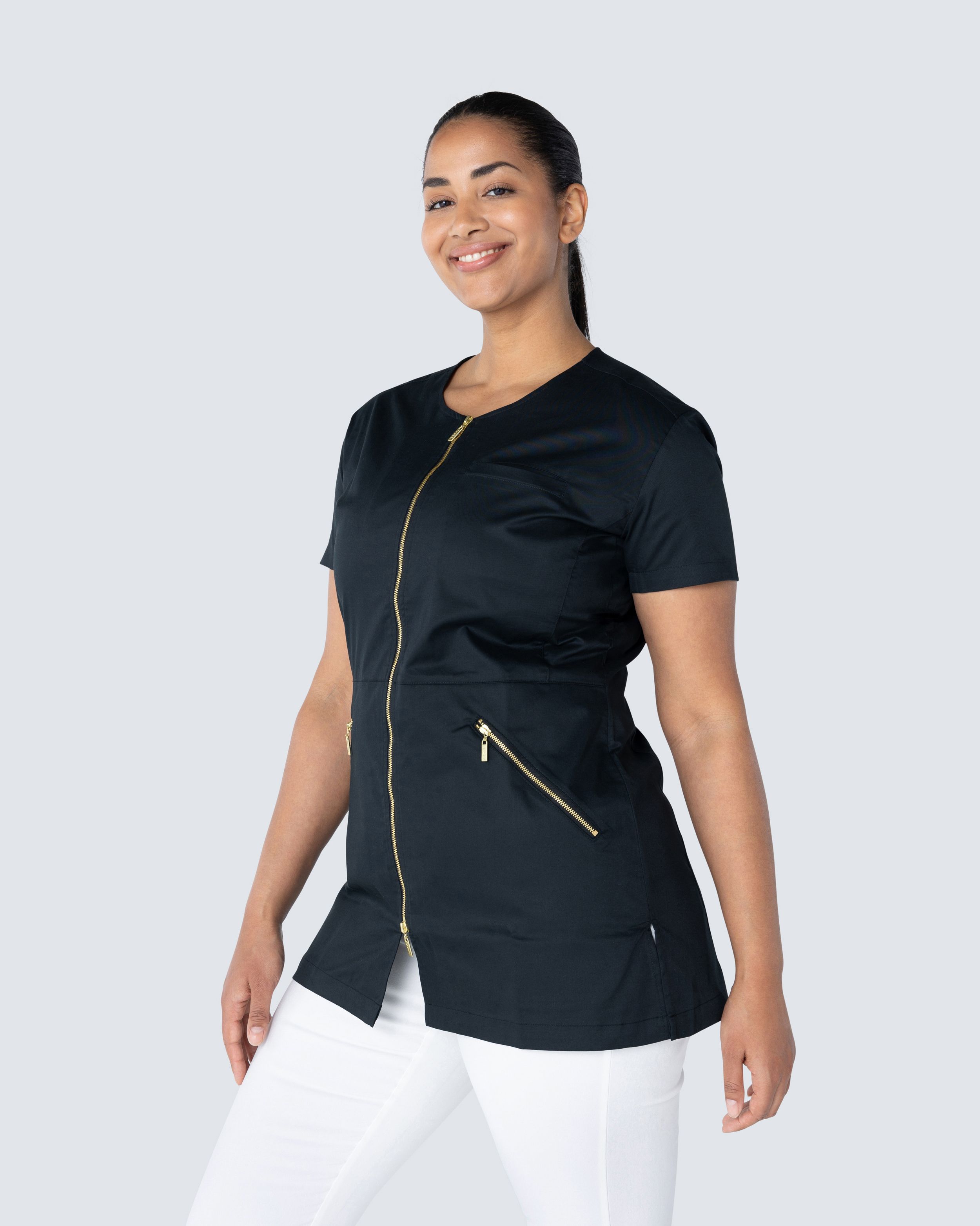 Figursydd topp från Wear at Work, som är tillverkad i ett slitstarkt och skönt stretchtyg. Rundhalsad modell med kort ärm. Sprund i sidorna och 2-vägsdragkedja framtill för full rörelsefrihet.
